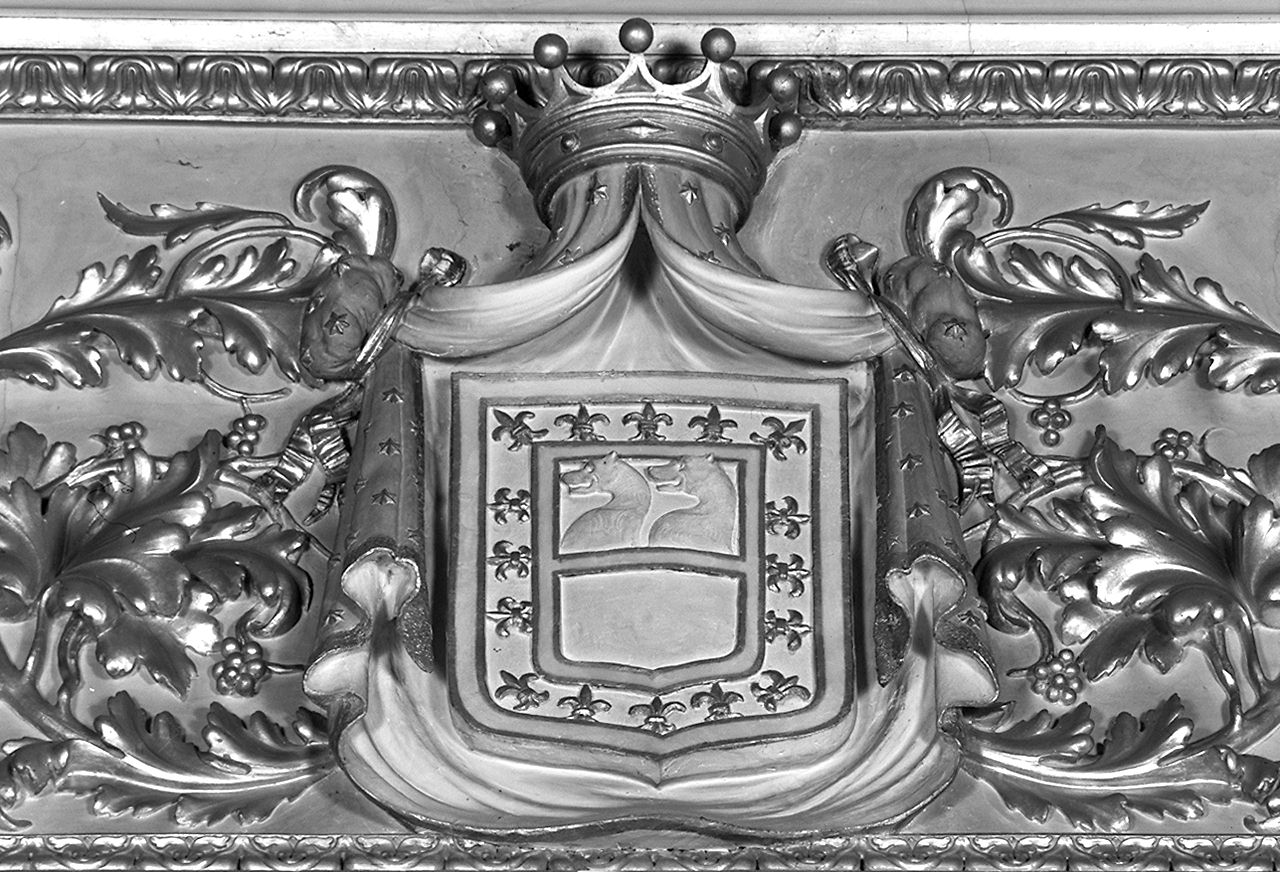 Motivi decorativi a girali vegetali, putti, cavalli alati; nei quattro angoli coppe con fiori e frutta; al centro dei lati lunghi, stemmi entro cortine sormontate da corone. Cornice di raccordo con le pareti a foglie d'acanto e fiori