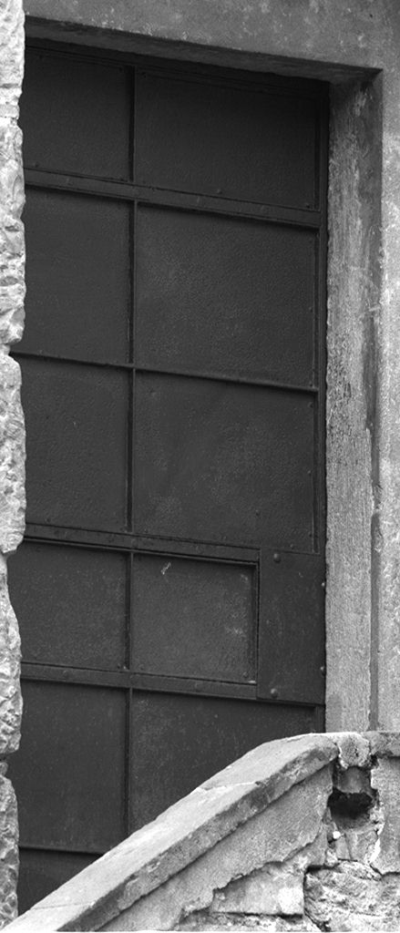 Porta costituita da pannelli fissati a telaio, rinforzo con sbarre verticali inchiodate a tergo