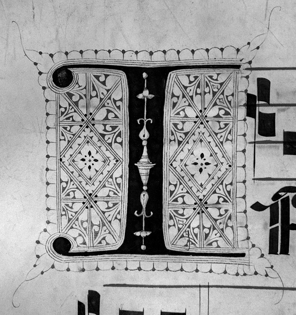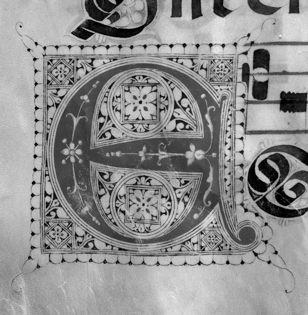 251 iniziali filigranate in inchiostro rosso e azzurro, alternati fra lorocon filigrana di colore inverso. Le lettere sono presenti in due dimensioni: piccola (1 rigo di scrittura + 1 rigo di musica) e grande (2 righi dimusica + 2 di scrittura). Il corpo della lettera è fesso ed ha la linea difessura risparmiata in bianco a forma di candelabra o di tralcio vegetale. Il campo della lettera è di forma geometrica e presenta tutt'intorno unasmerlatura perlinata, agli angoli una piccola propaggine termina con un ricciolo delineato da un sottile tratto di penna. La filigrana riempie interamente il campo e forma motivi geometrici e vegetali stilizzati