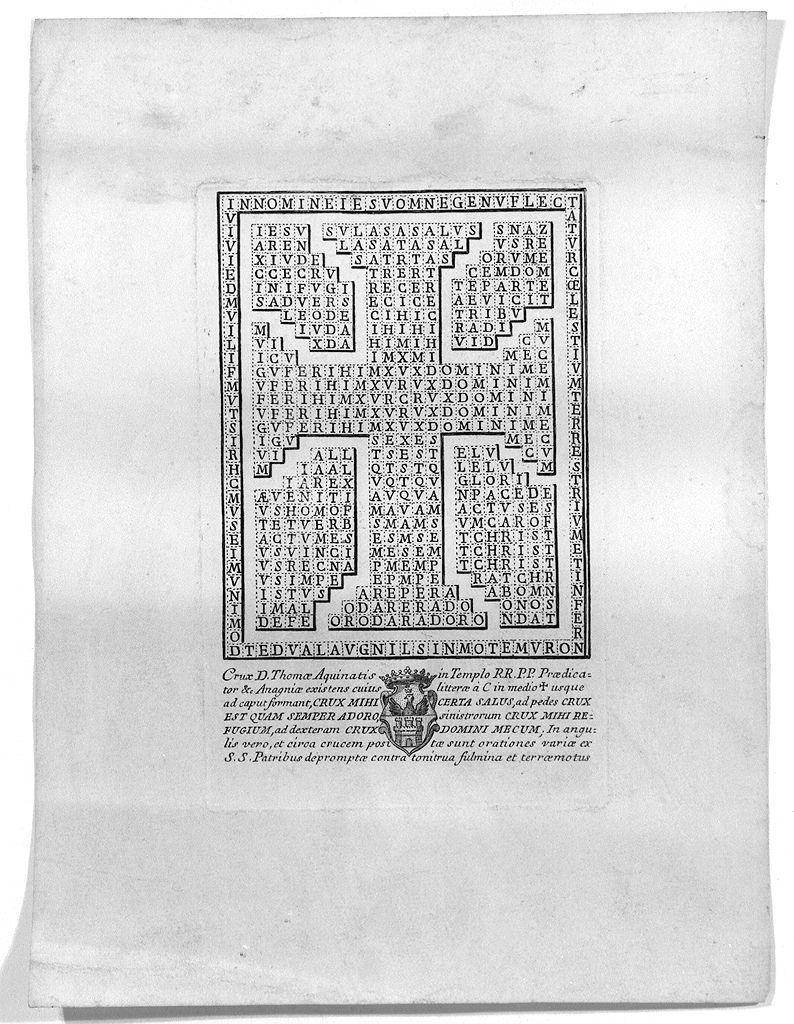 - ISCRIZIONI in basso - Crux D(ivi) Thomae Aquinatis in Templo R(everendorum) P(atrum) Predica=/tor &c Anagniae existens cuius litterae a C. in medio [cruce] usque / ad caputi formant, CRUX MIHI CERTA SALUS, Ad pedes CRUX / EST QUAM SEMPER ADORO, sinistrorum CRUX MIHI RE=/FUGIUM ad dexteram CRUX DOMINI MECUM; in angu=/lis vero, et circa crucem positae sunt orationes variae ex S(anctis) Patribus de promptae contra tonitrua fulmina et terraemotus - corsivo/ lettere capitali -
