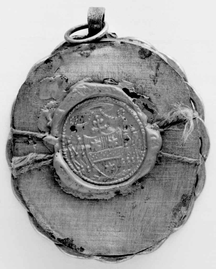 - ISCRIZIONI sul filatterio - Oss(ibus) S(ancti) Rayneriy C(---) PIS(is) - corsivo - a penna - latino