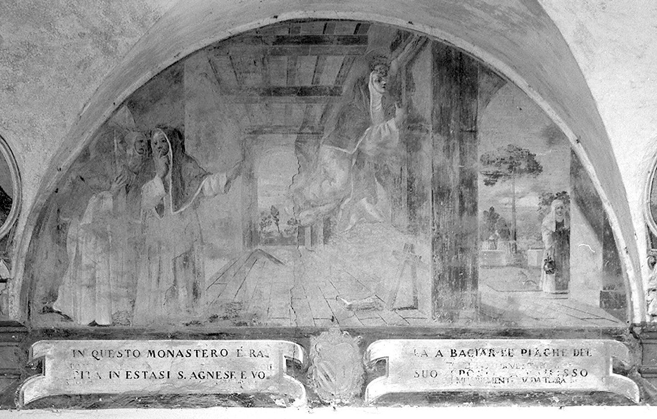 - NOTIZIE STORICO CRITICHE La decorazione del lato sud del chiostro di S. Agnese è documentata in un libro di memorie del convento, compilato nel XVIII secolo e conservato presso l'Archivio di Stato di Firenze. I lavori si protrassero presumibilmente dal 1632 al 1652 ca.: le memorie del convento, seppur frammentarie, parlano dell'esecuzione di nove lunette e fanno il nome di Ottavio Capponi, pittore non altrimenti identificato. L'episodio qui rappresentato si riferisce ad uno dei molteplici rapimenti estatici dei quali fu protagonista la santa poliziana durante la sua permanenza nel monastero di Proceno.Per notizie complete riguardo all'esecuzione dell'intero ciclo pittorico del chiostro cfr. scheda n. cat. gen. 0900466075