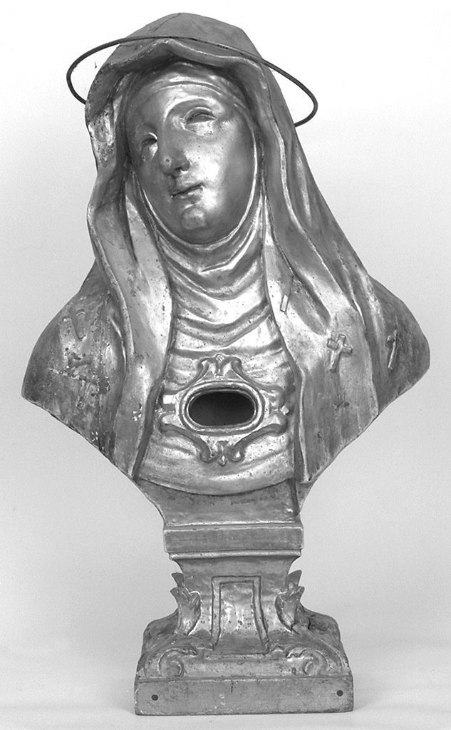 - NOTIZIE STORICO CRITICHE Il reliquiario è privo del vetro che proteggeva la teca, che non contiene più alcuna reliquia. Il manufatto, che riprende un modello di busto-reliquiario ampiamente diffuso nel XVII secolo, è stilisticamente collocabile nella prima metà del XVIII secolo. Esso viene citato nella Guida al santuario di S. Agnese Segni come reliquiario della santa poliziana (Guida al santuario di S. Agnese Segni - Montepulciano,Arti Grafiche Il Cenacolo, Firenze 1975, p. 53). Nella chiesa di S. Agnese si conservano altri reliquiari a busto tipologicamente e stilisticamente affini a questo(vedi schede n. cat. gen. 0900466224, 0900466225, 0900466451, 0900466453)