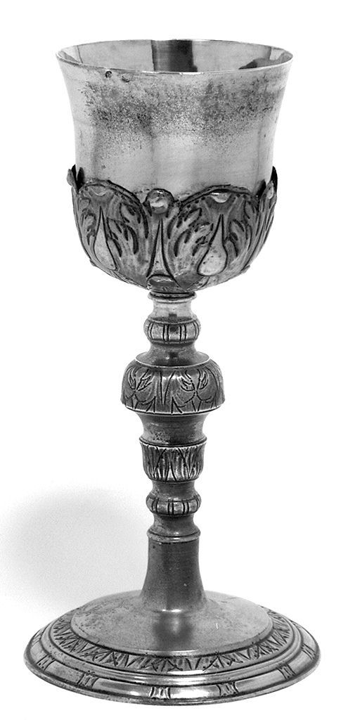 - NOTIZIE STORICO CRITICHE Il calice presenta due punzoni sul bordo superiore della coppa ormai completamente illeggibili. Nella parte interna del piede è incisa una iscrizione, di cui è leggibile solamente la data 1772, sen'altro relativa alla esecuzione del manufatto. Altri due punzoni sono posti sotto il piede, ma solamente uno di questi è parzialmente leggibile. Si tratta del marchio camerale di garanzia usato dal bollatore della zecca dello Stato Pontificio. L'attuale condizione del punzone, parzialmente consunto, non consente di sapere se le chiavi di san Pietro ivi rappresentate fossero accompagnate dall'ombrello liturgico oppure dal triregno