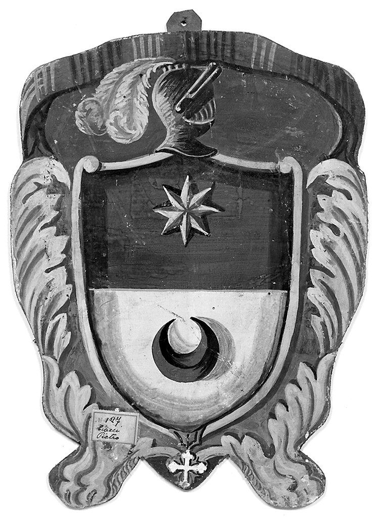 - STEMMI gentilizio - Stemma - Ciacci - Scudo sannitico sormontato da elmo piumato, accollante croce trilobata. Blasonatura: troncato nel primo d'azzurro alla croce a otto punte d'oro, nel secondo d'argento al crescente d'azzurro