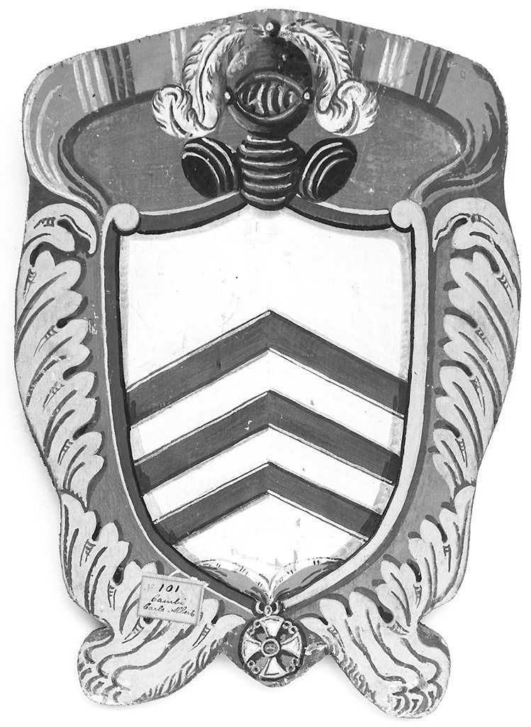- STEMMI gentilizio - Stemma - Cambi - Scudo sannitico sormontato da elmo piumato. Blasonatura: d'argento ai tre scaglioni d'azzurro