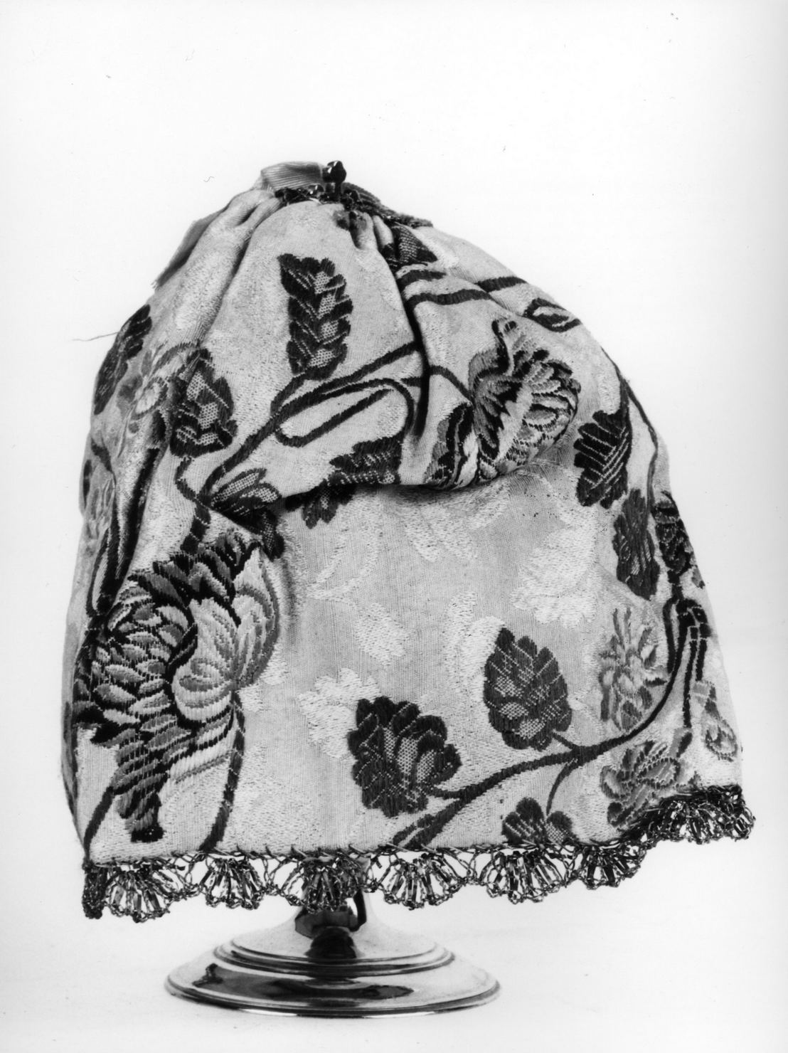 Fondo avorio, opera verde, viola, giallo, rosa, rosso. Gallone a fuselli in filo dorato e filo lamellare dorato. Fodera in gros de Tours di seta marezzato bianco