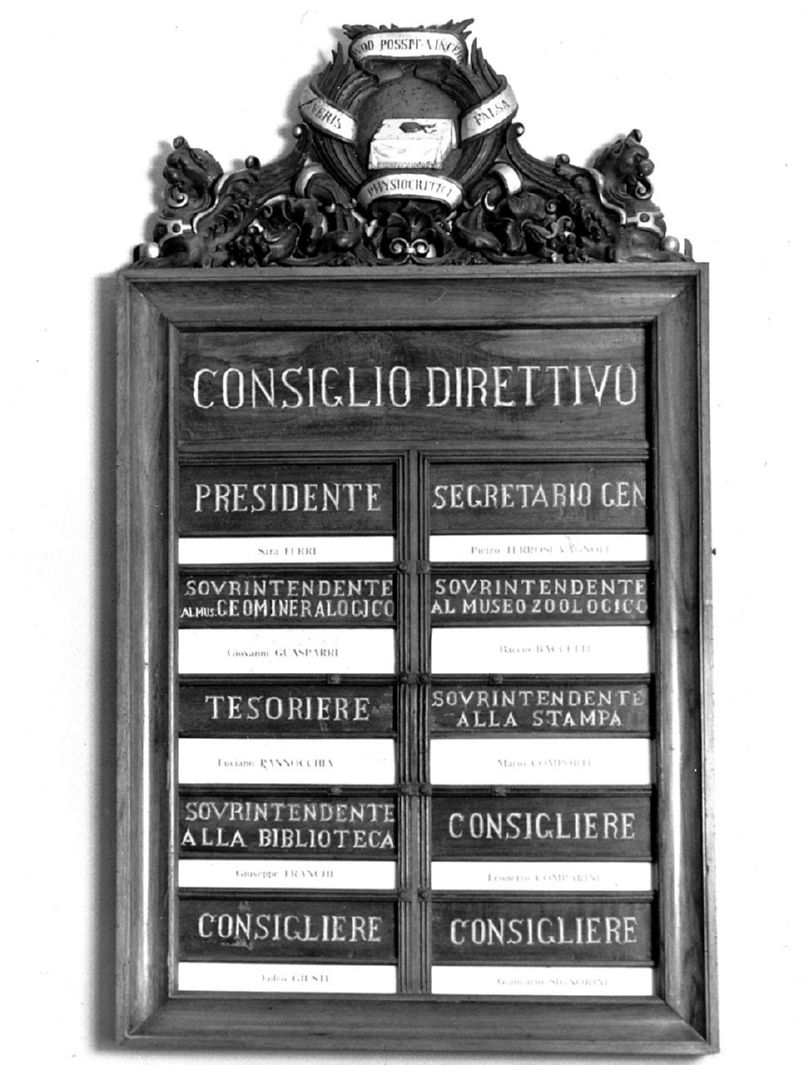 - ISCRIZIONI a tutto campo - Consiglio direttivo/ Presidente/ Segretario Gen(erale)/ Sovrintendente al Mus(eo) Geonimeralogico/ Sovrintendente al Museo Zoologico/ Tesoriere/ Sovrintendente alla Stampa/ Sovrintendente alla Biblioteca/ Consigliere/ Consigliere/ Consigliere - lettere capitali -