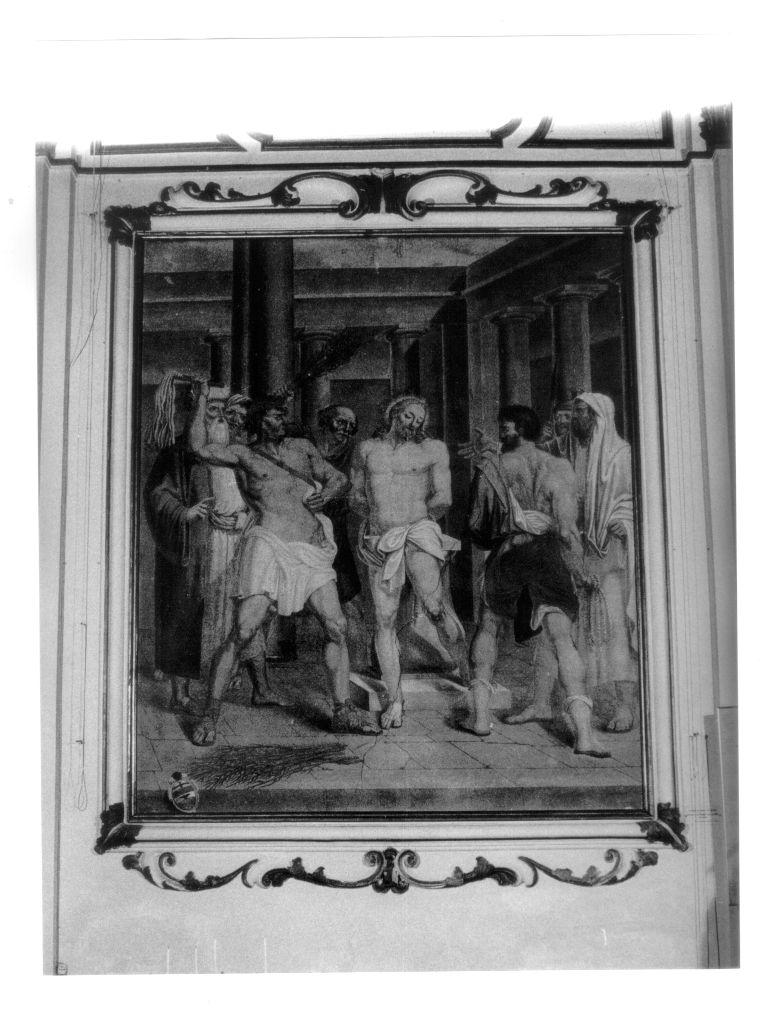 Al centro sta Cristo mentre viene flagellato da alcuni uomini disposti ai due lati. Sullo sfondo sorge un edificio con colonne
