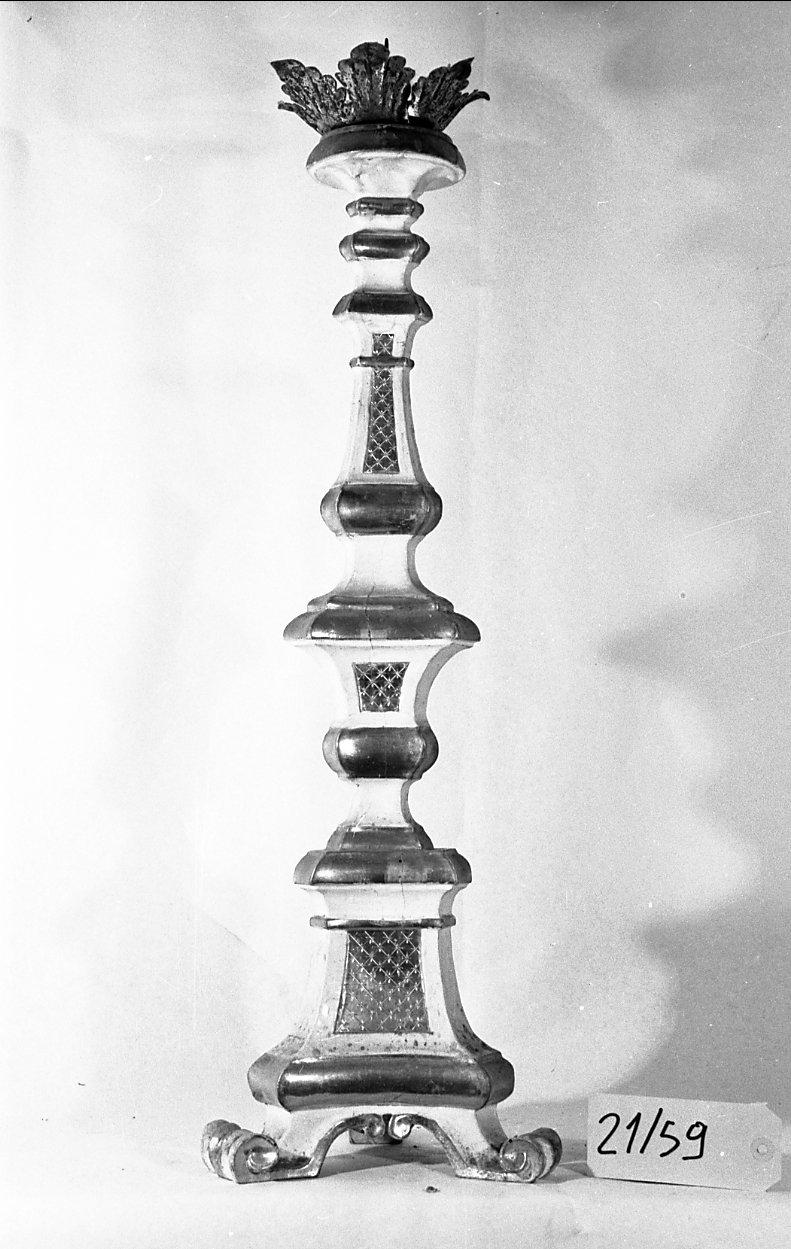 Candeliere di legno dipinto bianco e oro, su base a zezione triangolare con zampe a volute vegetali. Fusto composto da nodi e cartelle con motivi decorativi incisi a rete con stelline. Solo il fronte è decorato
