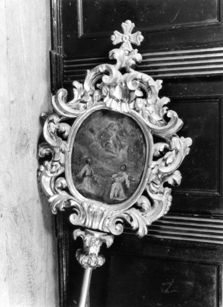 Insegna processionale. Mostra ovale, con cornice a volute frondose intrecciate a tralci fioriti e croceapicale, includente campo dipinto. L'insegna raffigura una Madonna con Bambino su nuvole e due Santi Domenicani inginocchiati