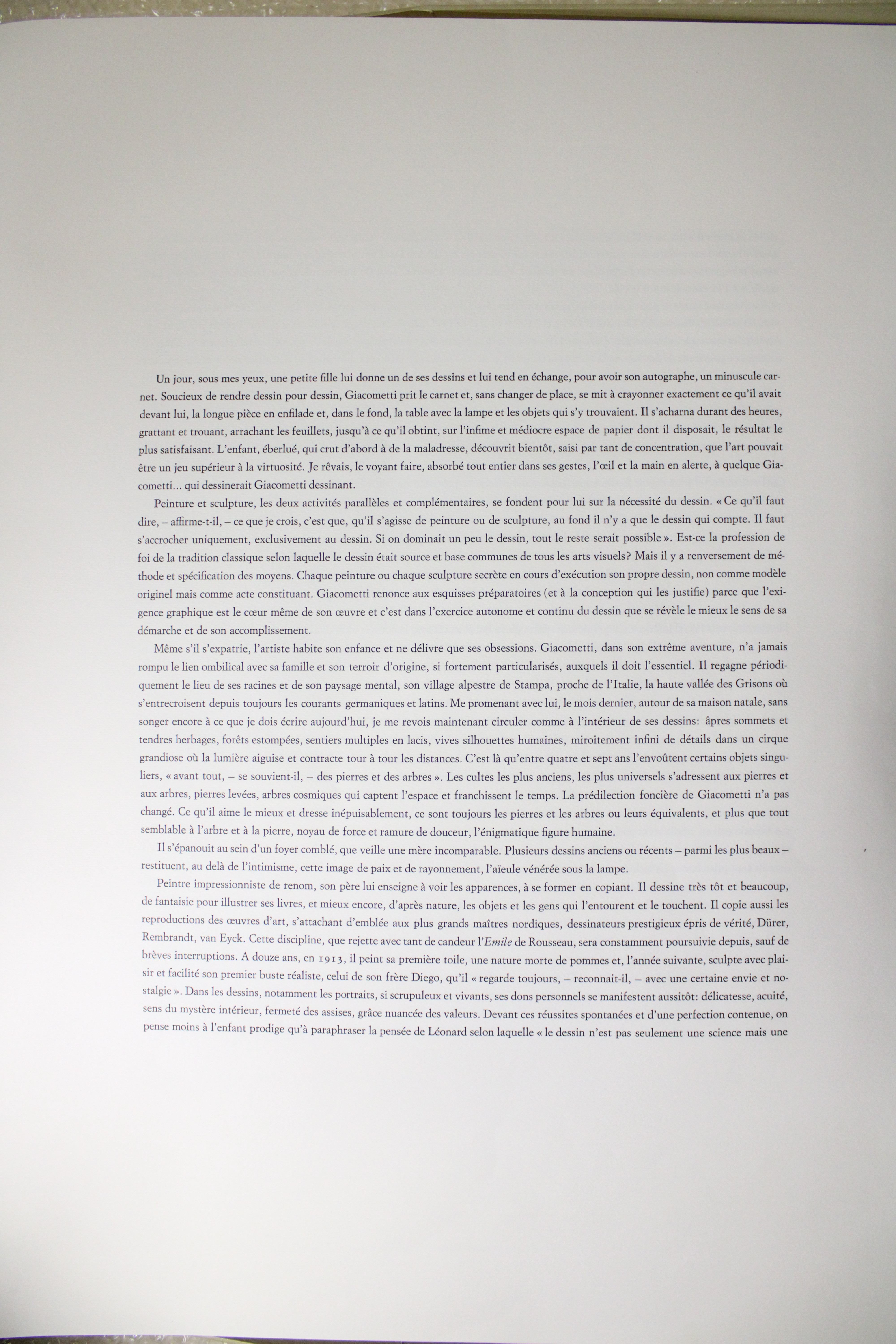 - NOTIZIE STORICO CRITICHE La riproduzioni delle opere di Alberto Giacometti furono pubblicate dalla casa editrice Einaudi nel 1963. La raccolta costituisce l'esemplare n. 792 di una tiratura di 1245. Si tratta di una significativa selezione, curata da Lamberto Vitali, di disegni a matita o china conservati da importanti gallerie d'arte o collezionisti. Copre l'intera carriera dell'artista, dalle prime prove, del 1915, fino al 1963, tre anni prima della sua morte. La serie è accompagnata da una prefazione di Jean Leymarie che sottolinea l'importante ruolo svolto dal disegno nell'intera produzione di Giacometti. "Pittura e scultura, le due attività parallele e complementari, si fondano per lui sulla necessità del disegno