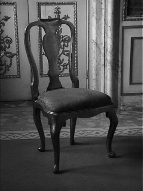 Gambe lisce e mosse; sedile con fasce sagomate; schienale sagomato a giorno a profilo ricurvo con cartella centrale a forma di vaso