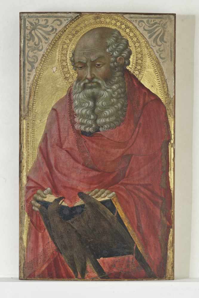 - NOTIZIE STORICO CRITICHE Nella tavola è raffigurato il San Giovanni Evangelista. Il Santo indossa un vistoso manto rosso cupo (quasi bordeaux) che insieme alla sua lunga barba grigia, nasconde quasi per intero la veste blu. Il suo sguardo si rivolge al libro del vangelo che poggia su di uno scrittoio a forma di aquila. Quest' ultima è di color marrone verdastro, mentre la legatura del libro è raffigurata in un color blu della stessa intensità della veste dell' evangelista. Lo spessore delle pagine del libro è dipinto in un color ocra. Il San Giovanni Evangelista fa parte dello stesso polittico un tempo in San Cerbone cui apparteneva la Madonna col Bambino dello stesso Museo lucchese. Gli altri scomparti sono oggi divisi fra la pinacoteca capitolina di Roma e la National Gallery di Washington. Come sottolinea la Steinhoff Morrison (Steinhoff Morrison 1989) il motivo iconografico dello scrittoio a forma di aquila parrebbe trovare la sua origine nelle creazioni di Pietro Lorenzetti in particolare nella tavola con la Beata Umiltà oggi agli Uffizi. La stessa studiosa istituisce un confronto fra questo dipinto ed il trittico dello stesso autore raffigurante un San Pietro in cattedra fra i Santi Paolo e Giovanni Evangelista, un tempo nella chiesa di San Bartolomeo a Sestano (presso Castelnuovo Berardenga) ed oggi nella Pinacoteca di Siena. In effetti il San Giovanni condivide con l' imperiosa figura di Pietro almeno la preziosità cromatica, la minuta resa di particolari come la decorazioni delle vesti, ed anche l' impronta della lezione di Ambrogio Lorenzetti. Probabilmente tuttavia il dipinto lucchese come propone Angelo Tartuferi (199(9 si può datare qualche anno prima del trittico già a Sestano