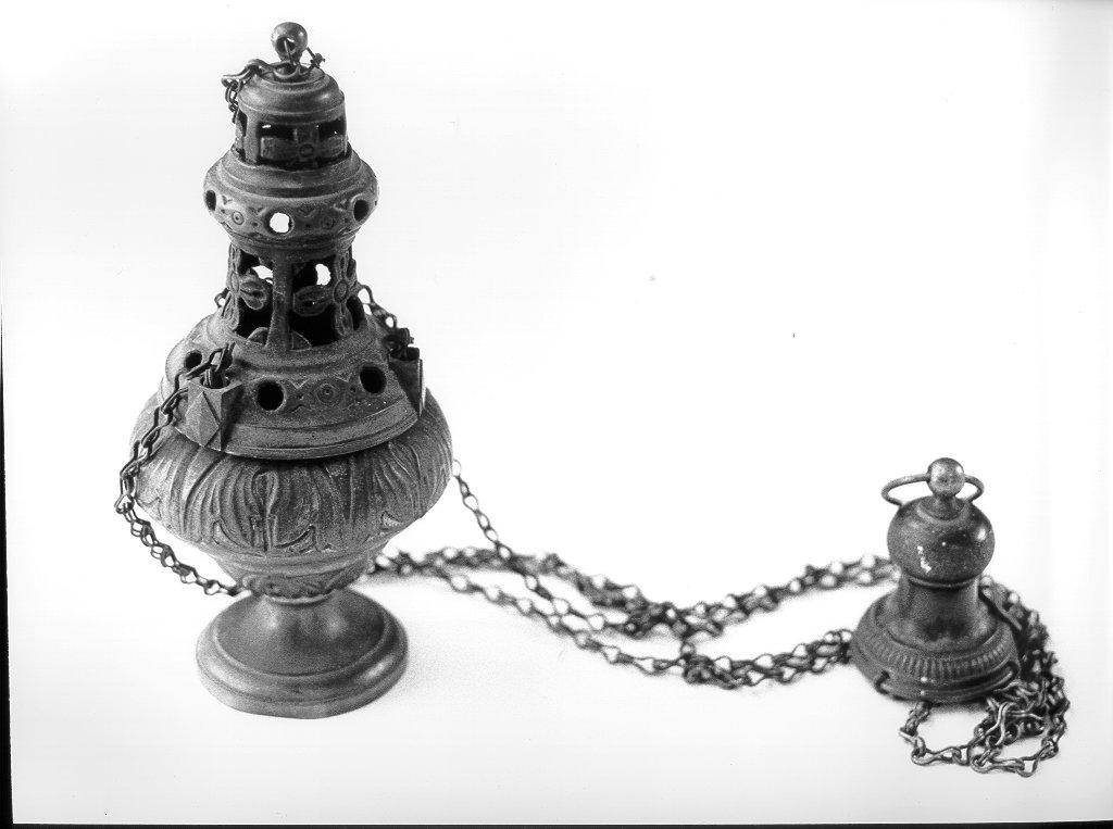 il turibolo ha base a sezione circolare, liscia, concava al centro. Il corpo a vaso termina con un anello bombato decorato a foglie d'acanto. Il coperchio è caratterizzato da una evidente sagomatura, è traforato e decorato da piccoli motivi a fiore