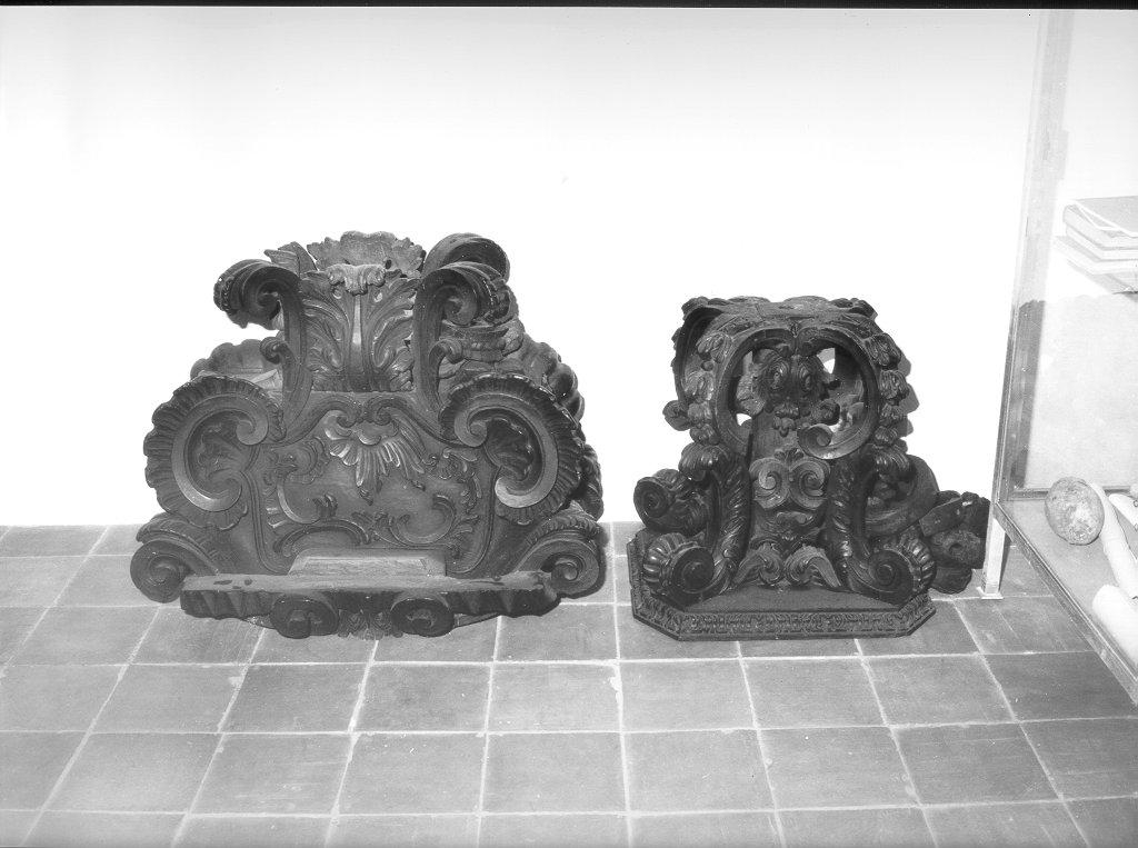 leggio da coro formato da due parti distinte, sovrapposte: un corpo basso a due ante caratterizzato da cornici mistilinee a rilievo e fregi decorativi ai lati; la parte superiore è formata a sua volta da due segmenti che si sovrappongono, caratterizzati da volute a parentesi contrapposte, palmette, foglie d'acanto