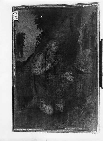 - NOTIZIE STORICO CRITICHE Contro lo sfondo di una vegetazione frondosa, in un luogo che si intuisce solitario, è la Maddalena genuflessa di fronte ad un crocifisso, un teschio e un libro, strumenti di meditazione e penitenza. Non è possibile avanzare alcuna ipotesi circa l'originaria collocazione della tela, molto danneggiata soprattutto nella zona inferiore dove si evidenziano cospicue cadute di colore, che sembrerebbe comunque riferibile all'ambito di Gaspare Mannucci e pertanto collocabile entro la prima metà del Seicento