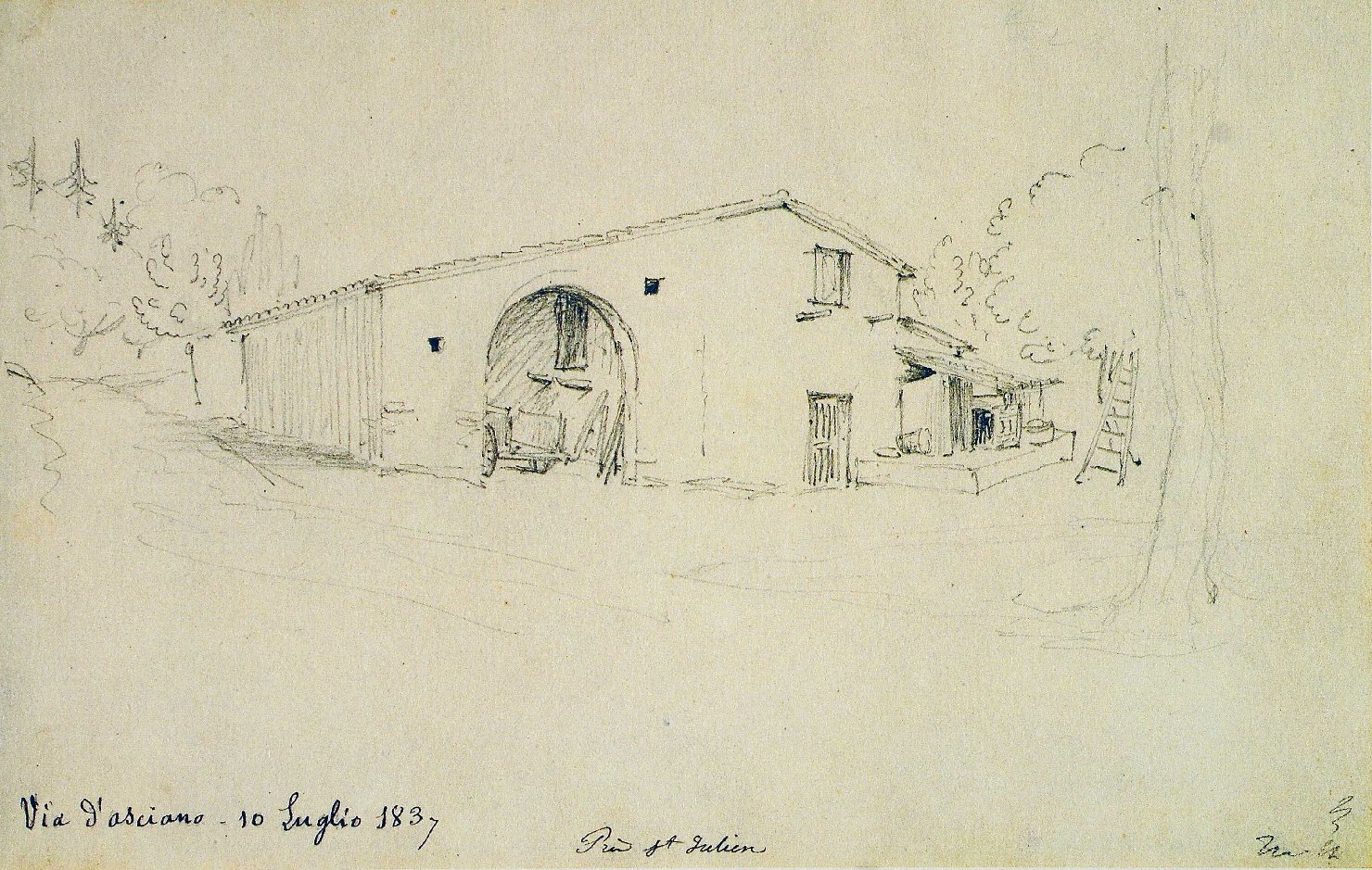 - ISCRIZIONI in basso - Via Asciano. 10 Luglio 1837. Ferme aux environsde S.t Julien. Colonne antique au coin du toit - corsivo - a penna -