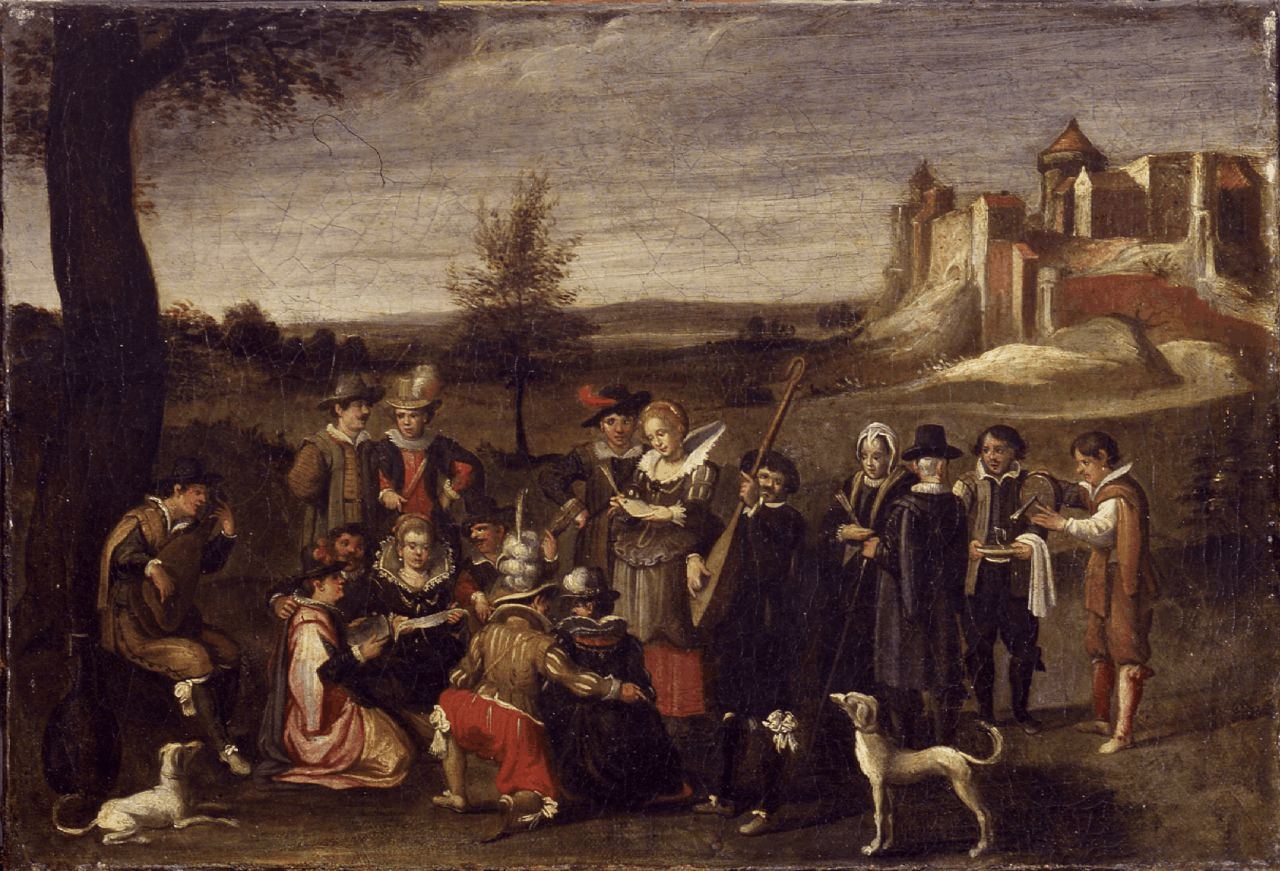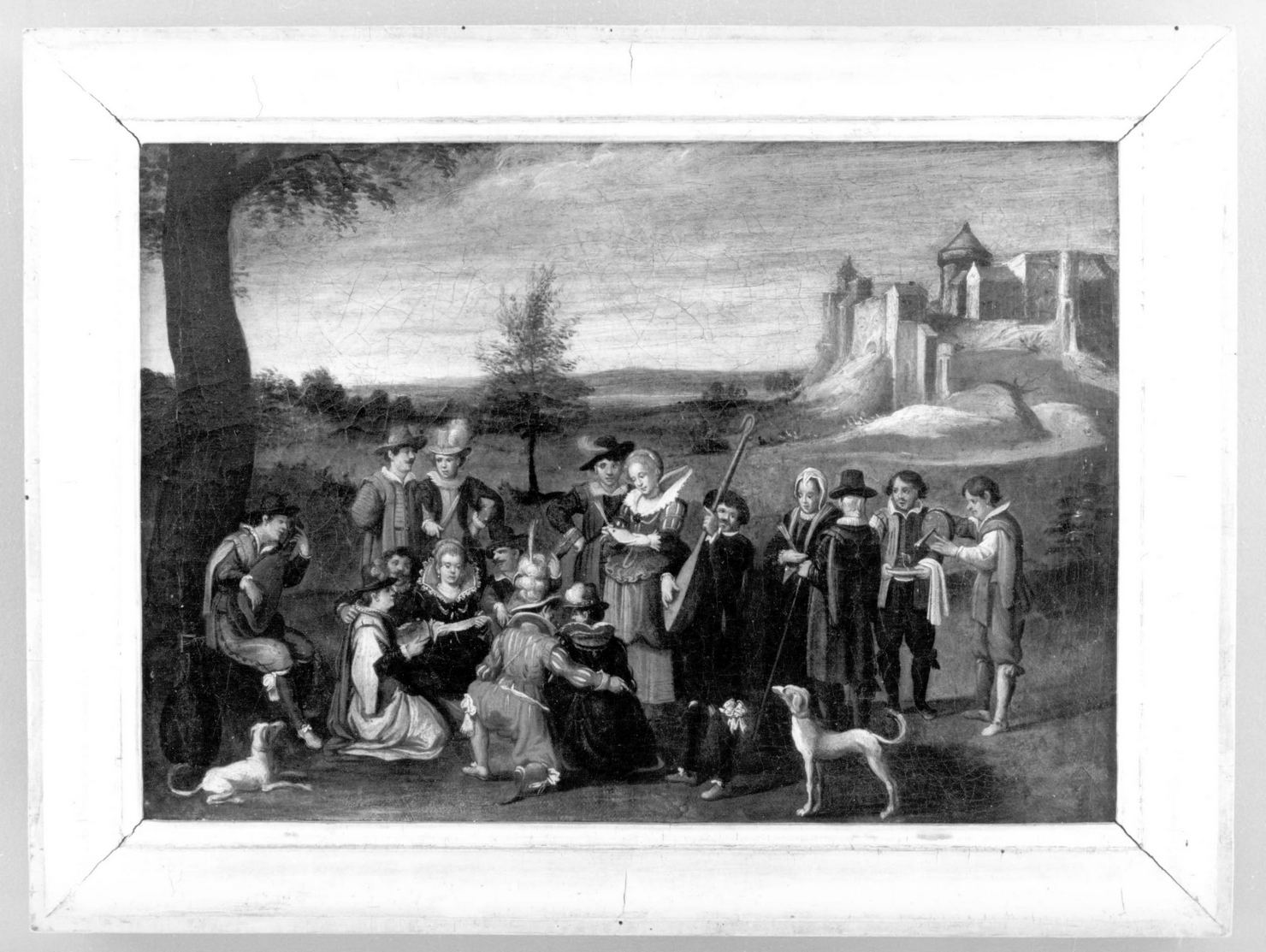 concerto campestre di giovani cortigiani e cortigiane vestiti alla moda con cappelli piumati, sullo sfondo paesaggio con colline, piante e borgo fortificato. figure: undici uomini, cinque donne; animali: due cani; strumenti musicali: due strumenti a corda, cembalo (?); oggetti: libro, piatto, bicchiere; paesaggio: colline, cespugli, alberi; architetture: borgo fortificato turrito