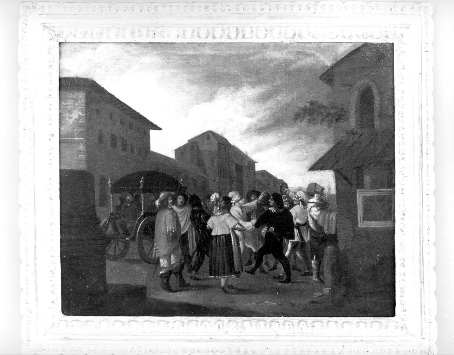 carnevalata per strada con figure maschili e femminili in maschera e non.figure: gentiluomo, popolani, uomini in maschera, donna; strumenti musicali: tamburello; oggetti: carro; architetture: vicolo con case