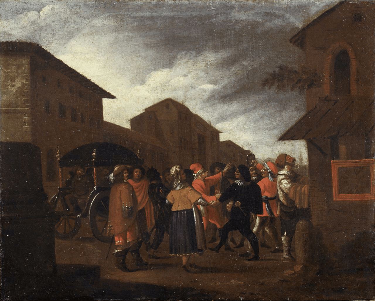 - NOTIZIE STORICO CRITICHE Il dipinto proviene dal lascito Crociani assieme alle altre due tele con cui costituisce una serie (nn. 150, 151). Nell'inventario Crociani (1861) le tele risultavano quattro, tutte con il medesimo soggetto. Il Brogi (1897) ne elenca ancora quattro confermandone l'esecuzione al pittore fiammingo Jan Miel (1599/ 1663). Della terza Carnevalata costituiente la serie si è persa traccia antecedentemente al 1961, data in cui le tele con questo soggetto presenti nell'inventario sono ormai tre. La pittura di genere contempla spesso tra i suoi soggetti l'illustrazione di feste carnascialesche preferendo scene di festosa verità e svago, accumunanti i vari ceti sociali. I dipinti si inseriscono a pieno titolo in questo filone di pittura decorativa che sceglie come modello il quotidiano nella sua normale banalità. Laura Martini (2000) analizzando i dipinti ne riporta la produzione in ambito italiano: dovuti a un pittore di modeste qualità che si muove sulla scia della produzione fiamminga in ambito romano; sensibilmente vicino alle opere di Johannes Lingelbach (artista olandese di adozione in Italia dal 1640 al 1650), soprattutto negli sfondi architettonici in fuga prospettica trasversale, tanto da far ipotizzare alla studiosa che questi dipinti possano essere delle copie. La vivacità narrativa della festa in maschera appare bloccata da una conduzione pittorica sommaria e non esente da rigidezze nel disegno
