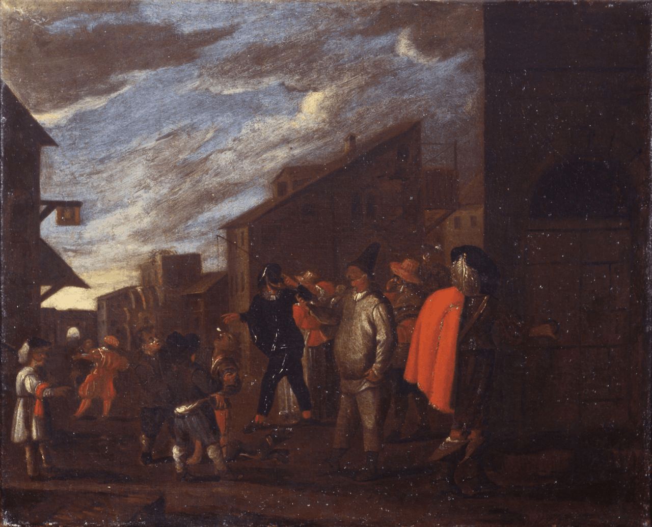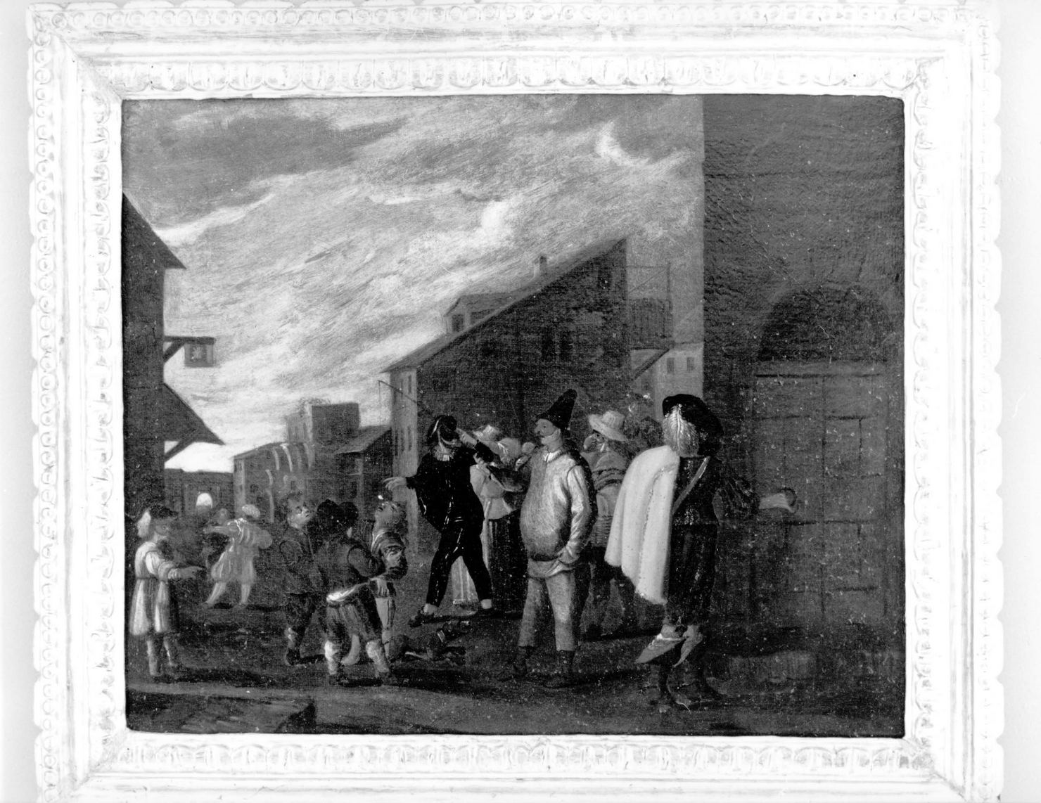 carnevalata per strada con figure maschili e femminili in maschera e non.figure: nani, bambini, gentiluomo con cappello piumato e mantello posto di spalle, popolani, uomini in maschera; oggetti: canna con ghiottoneria attaccata alla lenza; architetture: vicolo con case