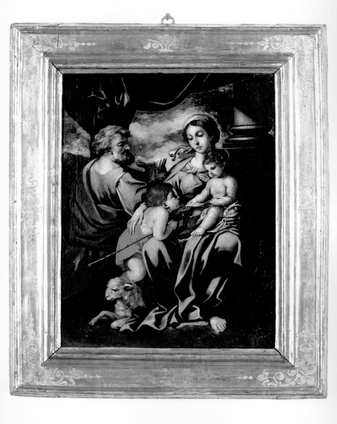 Personaggi: Madonna; Gesù Bambino; san Giovanni Battista fanciullo; san Giuseppe. Attributi: (san Giovanni Battista) agnello; (san Giovanni Battista) croce di canna; (san Giovanni Battista) vessillo. Elementi architettonici: colonna. Oggetti: tendaggio