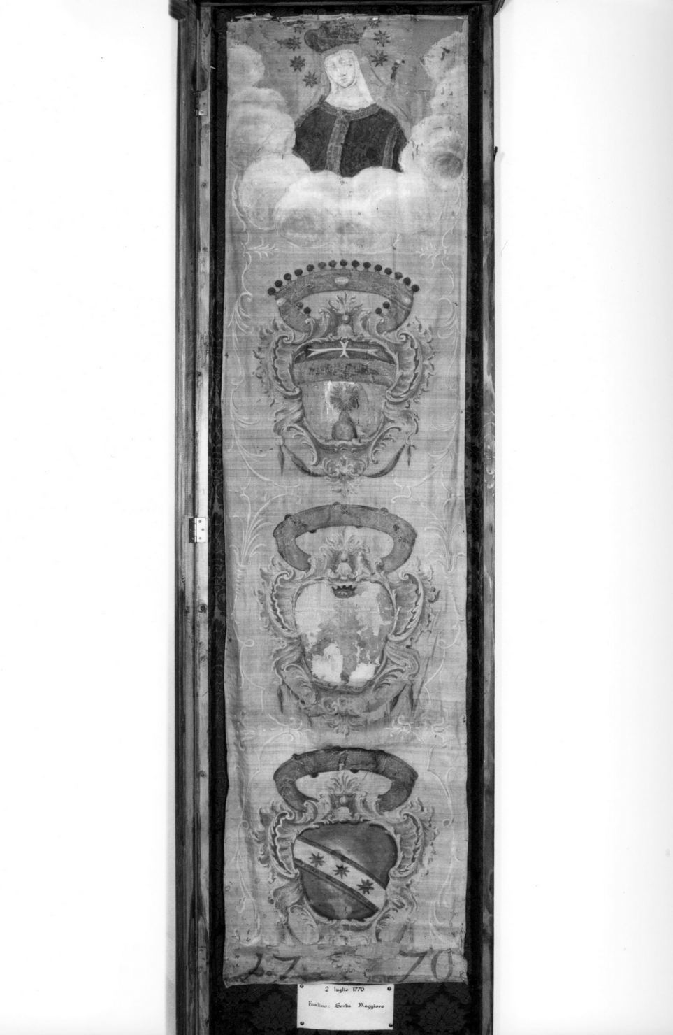 drappellone con fondo bianco, incorniciato ai lati da un motivo di nastrirosa. In alto è l'immagine della Madonna di Provenzano coronata, aureolata di sette stelle e collocata su nubi; al di sotto sono i tre stemmi gentilizi dei Signori del Brio e in basso è la data
