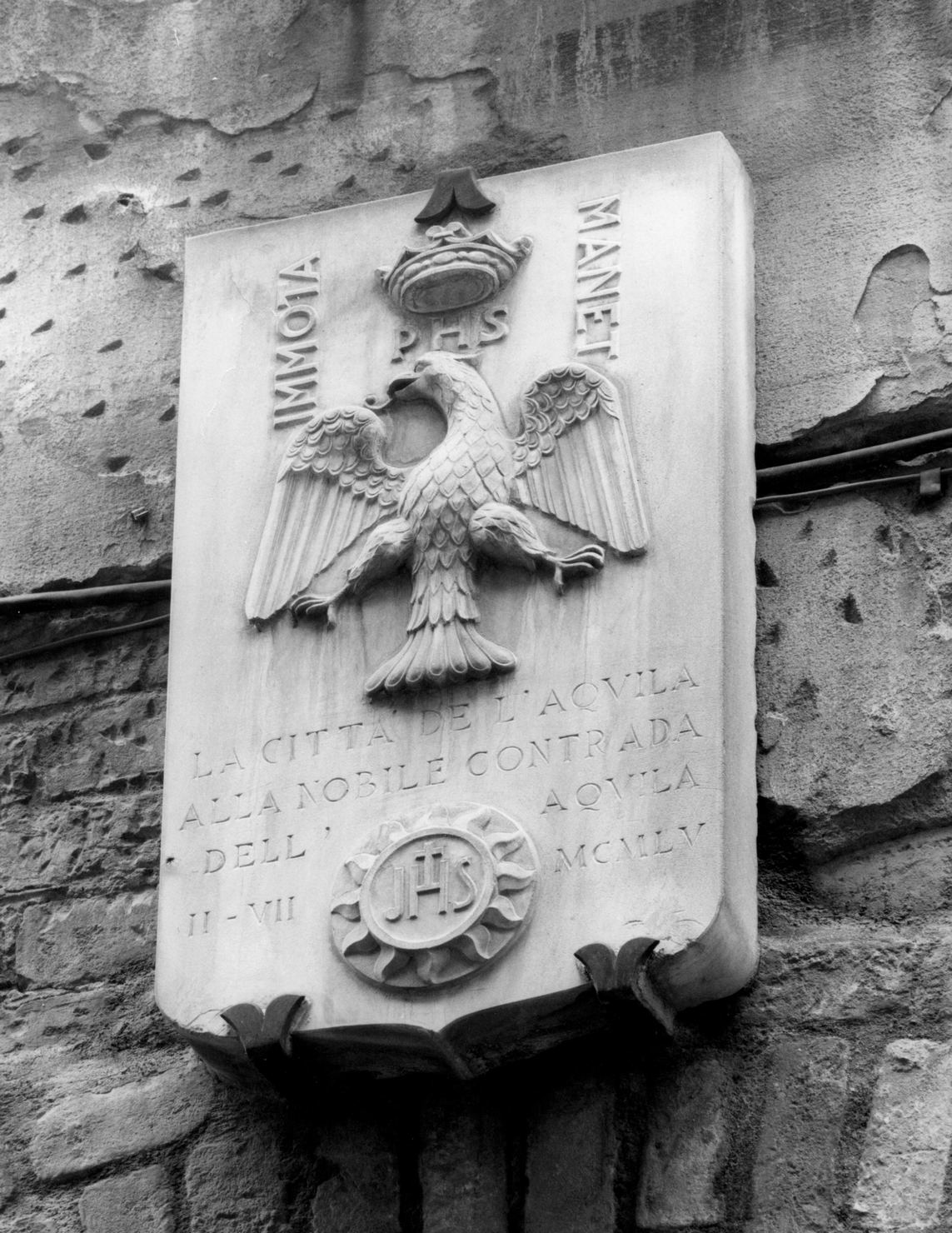 Scudo sannitico in pietra ove sono scolpiti in alto l'emblema della cittàde L'Aquila e in basso l'emblema di San Bernardino; tra i due emblemi corre una iscrizione