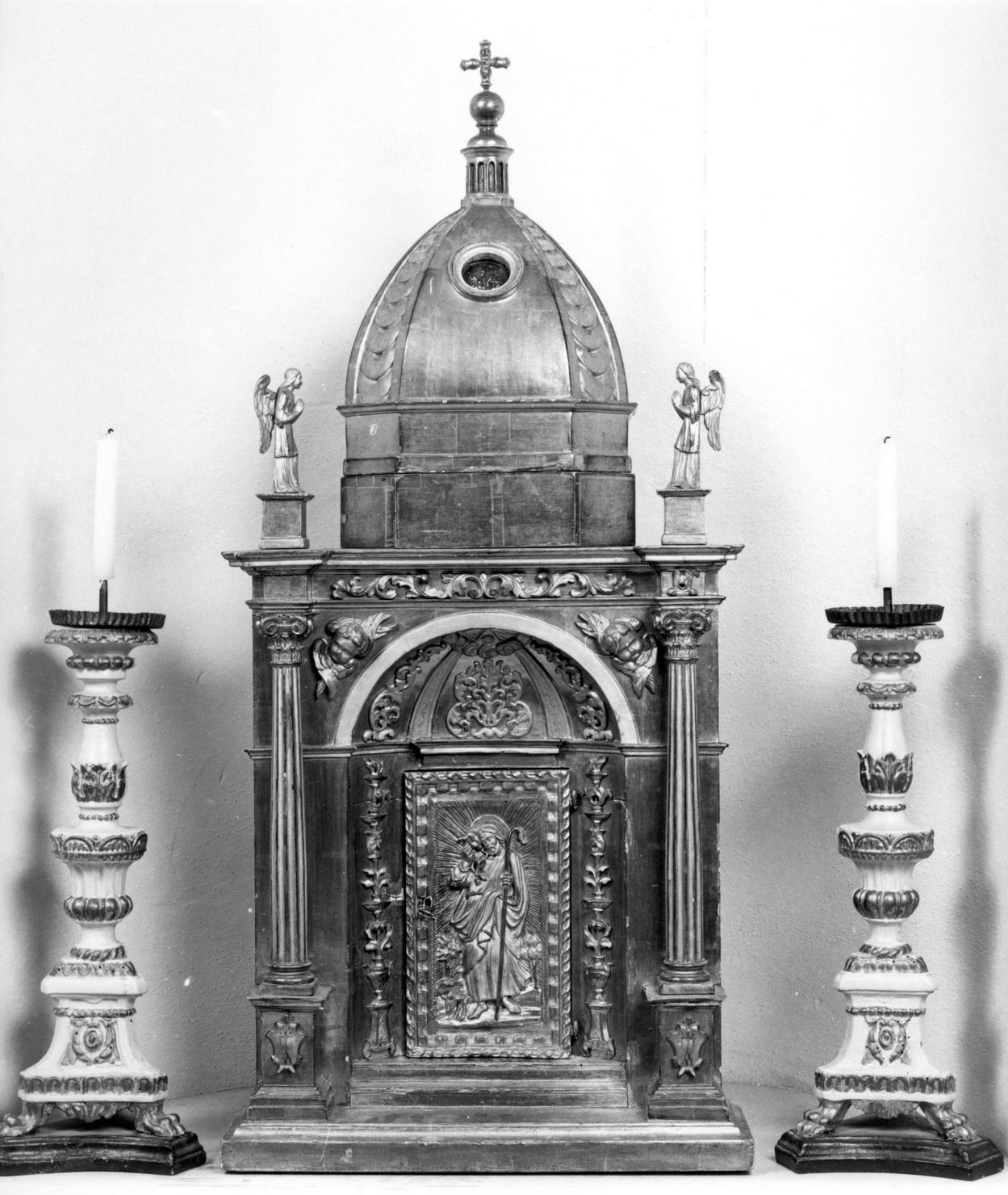 tabernacolo a tempietto; fronte ornata da due colonne scanalte che incorniciano la nicchia centrale con sportello decorato con l'immagine di Cristo come Buon Pastore. In alto, a destra e a sinistra, due angeli a tutto tondo affiancano la cupola con lanterna e crocetta apicale. Le pareti interne sono foderate in taffetas di seta avorio dipinto e ricamato