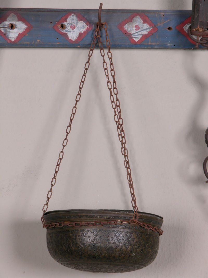 - NOTIZIE STORICO CRITICHE L'oggetto, di cui non conosciamo esattamente la funzione, presenta una decorazione assai inconsueta con motivi di foglie e arabeschi di stile orientale, assimilabili ad esempio a quelle presenti sulle armature da cavaliere che l'Islam diffuse dalla Persia all'India, che mantennero nei secoli caratteristiche costanti appena variate nella qualità della materia e nella preziosità delle decorazioni. Pensiamo pertanto che l'oggetto possa essere di provenienza orientale e che sia stato portato qui dal conte Silvio Piccolomini, ultimo discendente della famiglia che visse nel Palazzo fino alla morte avvenuta nel 1962. Il conte e la moglie Anna Menotti vengono infatti ricordati dal canonico Giovanni Battista Mannucci, non solo come i committenti dei restauri al Palazzo eseguiti tra il 1905 e il 1911, ma anche per aver arricchito il Palazzo con "pregevoli oggetti d'arte, di mobili, di stoffe, di tappeti preziosi, di stemmi in pietra e di ricordi di famiglia, con una ricca collezione di monete d'oro e d'argento di Pio II, di sigilli, pergamene e di opere manoscritte pregevolissime con numerosi incunaboli e Bolle dello stesso Pontefice umanista, di Pio III e di Alessandro Piccolomini" (G. B. Mannucci, "Pienza. Arte e Storia", terza edizione, Siena, Stabilimento San Bernardino, 1937, p. 93)