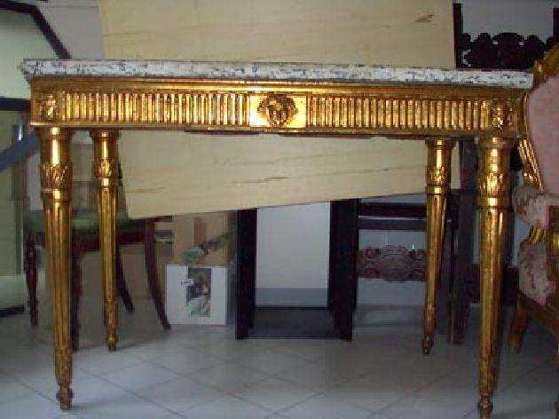 Console in legno intagliato e dorato con piano in marmo cipollino. Il tavolo è sostenuto da quattro gambe affusolate, centinate e scanalate con intagli fogliacei ad acanto. La fascia sotto il piano è scanalata e presenta centralmente e in corrispondenza degli angoli riquadri con motivo di testina velata a rilievo