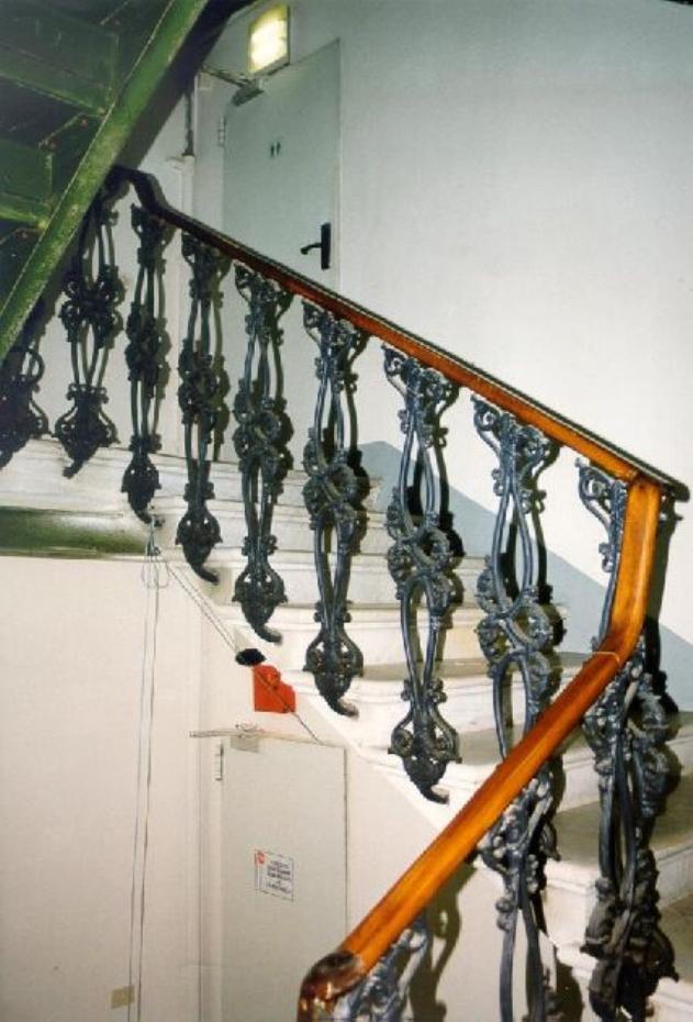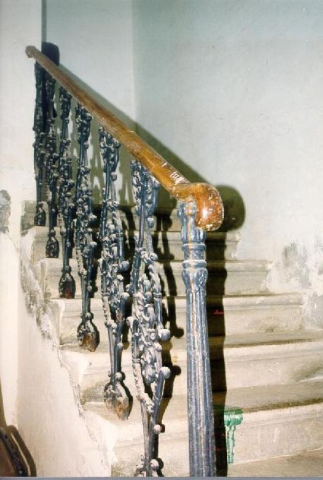 Balaustrata in ferro fuso composta da 77 elementi in ferro fuso e verniciato, coronata da corrimano in legno tornito e verniciato. La balaustrata si snoda senza soluzione di continuità, lungo le scale secondarie che uniscono il piano terreno al secondo. Ciascun elemento è composto in due parti speculari a volute fogliecee incrociate soprapposte unite al centro da fascette. Ogni parte disegna un motivo ansato unito all'estremita e terminante in volute fogliacee radiali