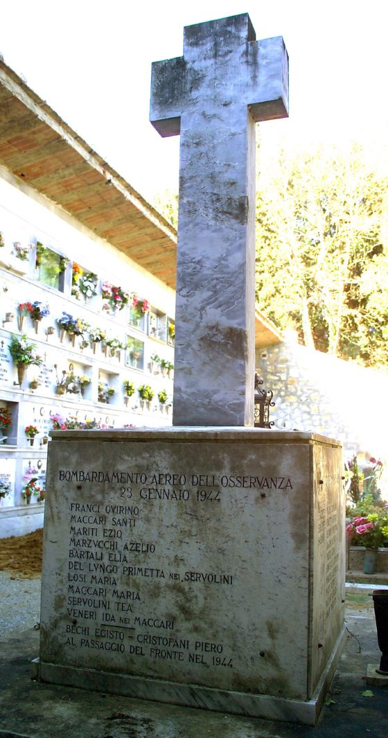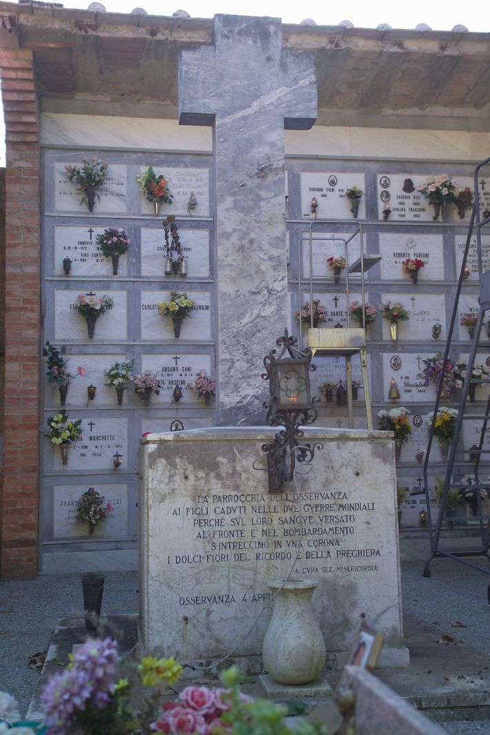 - ISCRIZIONI fronte del monumento - La parrocchia dell'Osservanza / ai figli caduti nelle due Guerre Mondiali / perché sul loro sangue versato / al fronte e nel bombardamento / s'intreccino in una corona / i dolci fiori del ricordo e della preghiera / a cura Sez. Misericordia / Osservanza 4 aprile 1954 - lettere capitali - a solchi -