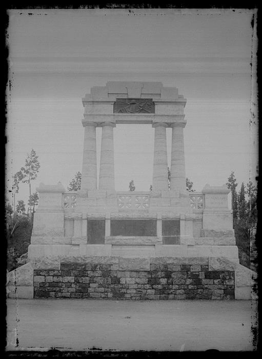 in basso blocchi di travertino in parte lavorati in parte lasciati a nuda roccia; al centro tre lastre di bronzo con i nomi dei caduti; sopra cornice in travertino decorata a bassorilievo da un festone d'alloro con nastro; più in alto quattro colonne lisce e possenti intervallate due a due da una balaustra, alle cui estremità si collocano le lapidi; sormonta il tutto struttura in travertino con al centro bassorilievo in bronzo, rappresentante un elmetto e una bandiera e un fucile incrociati