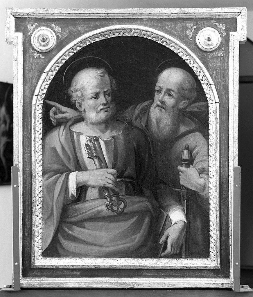 - NOTIZIE STORICO CRITICHE La testata di bara, che reca raffigurati da un lato la Madonna con il Bambino e i santi Pietro e Paolo dall'altro, va ricollegata alla testata di bara n. cat. gen. 0900461822. Giovan Girolamo Carli (1773-BCS C.VII.10 c. 21 r) parla dell'opera e riporta come indicazione cronologica il 1631, che secondo A. M. Guiducci (1993) era probabilmente segnato sulla struttura lignea, attribuendo la testata ad un allievo di Francesco Rustici. Brogi (1862 ed. 1897) ricordando l'opera nella canonica della chiesa dei santi Pietro e Paolo a Buonconvento la collega alla scuola di Francesco Vanni mentre alla Mostra dell'Antica Arte Senese essa veniva assegnata alla scuola di Domenico Beccafumi. Per B. Santi (1981) i dipinti devono essere riferiti alla bottega di Ventura Salimbeni, forse opera, come suggerisce Bagnoli, del figlio di Ventura Simondio che nell'attività giovanile rivela una stretta dipendenza stilistica dai moduli paterni. I due riquadri raffiguranti la (SEGUE IN OSSERVAZIONI:)