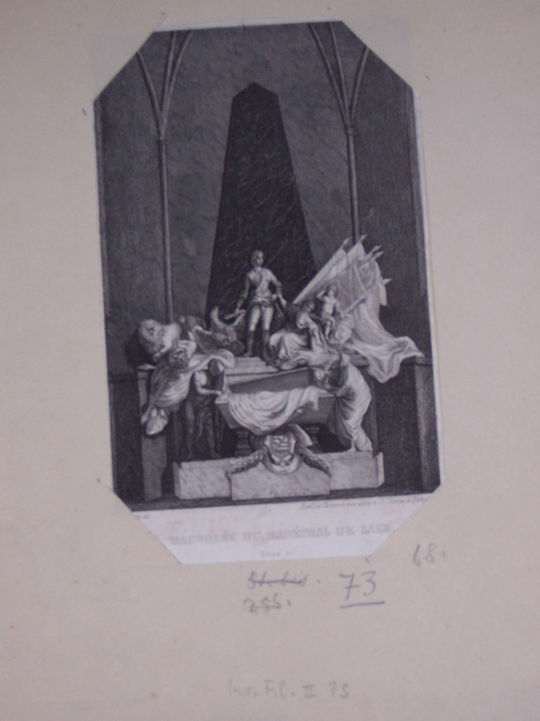 Architetture: monumento funebre con al centro un uomo armato un leone a destra un'aquila a sinistra e due figure in basso. Personaggi: Maresciallo di Sassonia