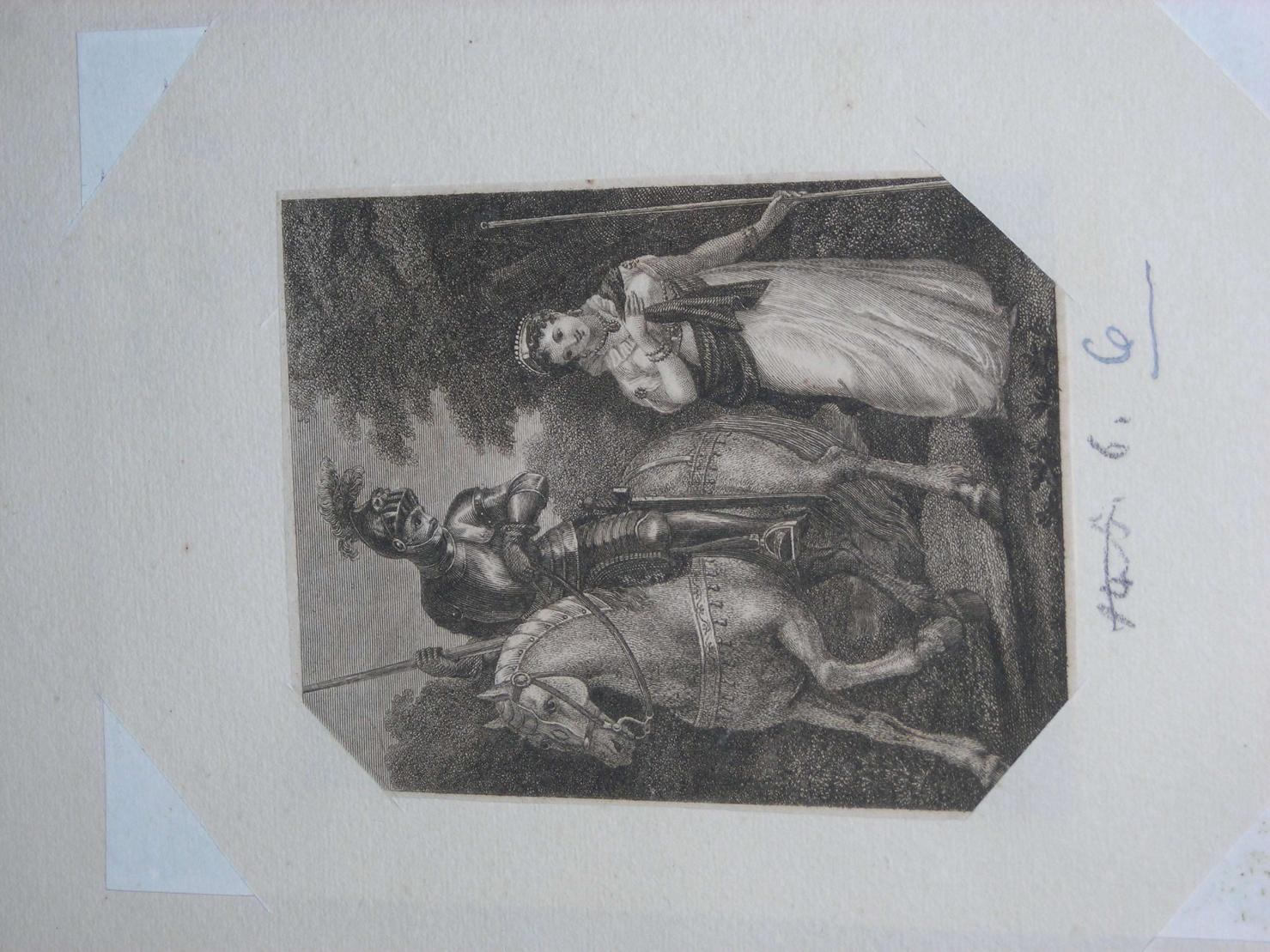 Personaggi: cavaliere a cavallo che omaggia una dama