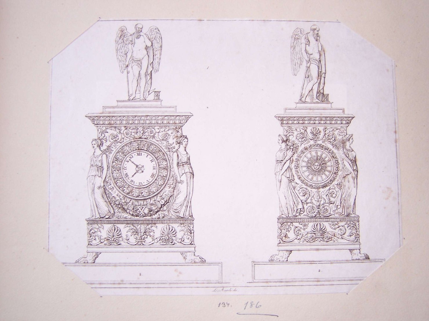 Oggetti: orologio con figure allegoriche del Tempo (in alto) e delle ore (sugli angoli) visto frontalmente e lateralmente