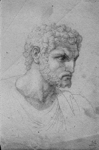 Testa virile classica. L'uomo ha i capelli e la barba ricciuti; gli occhi hanno un'espressione severa e guardano a destra