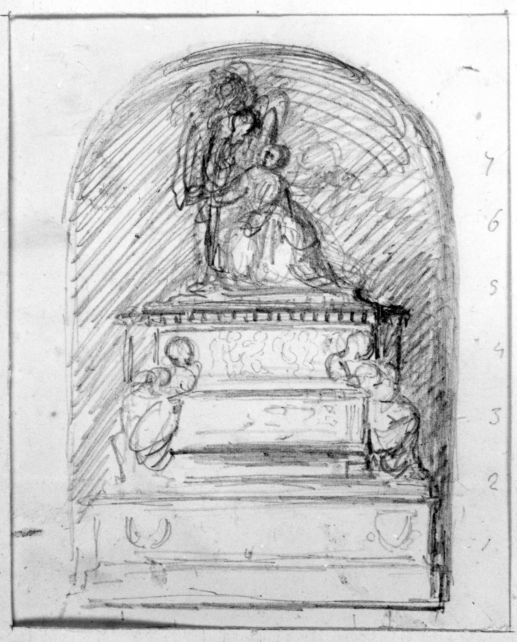 - NOTIZIE STORICO CRITICHE Il disegno è uno studio per il monumento funebre Ferrari Corbelli nella chiesa di San Lorenzo a Firenze. Il lavoro fu iniziato dal Dupré nel 1857 e terminato nel 1864. L'artista elaborò vari bozzetti scegliendo alla fine l'immagine principale con la raffigurazione dell'Angelo e l'Anima affiancata dalle personificazioni delle Virtù della contessa, la Modestia e la Carità