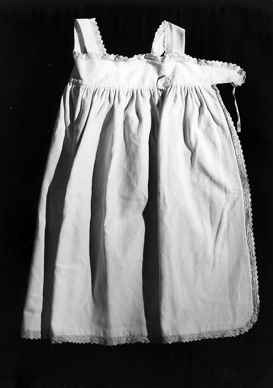 - NOTIZIE STORICO CRITICHE E' un accessorio, detto veste lunga, che serviva da coprifasce da casa e da passeggio, eseguito con materiali diversi a seconda delle stagioni e utilizzato indifferentemente da maschi e femmine. Sono documentate fin dagli anni '70 , ma già note nel XVI secolo. Il modello e la decorazione semplificata sono tipici del XX secolo ed indicano, nell'abbigliamento infantile una progressiva ricerca di praticità