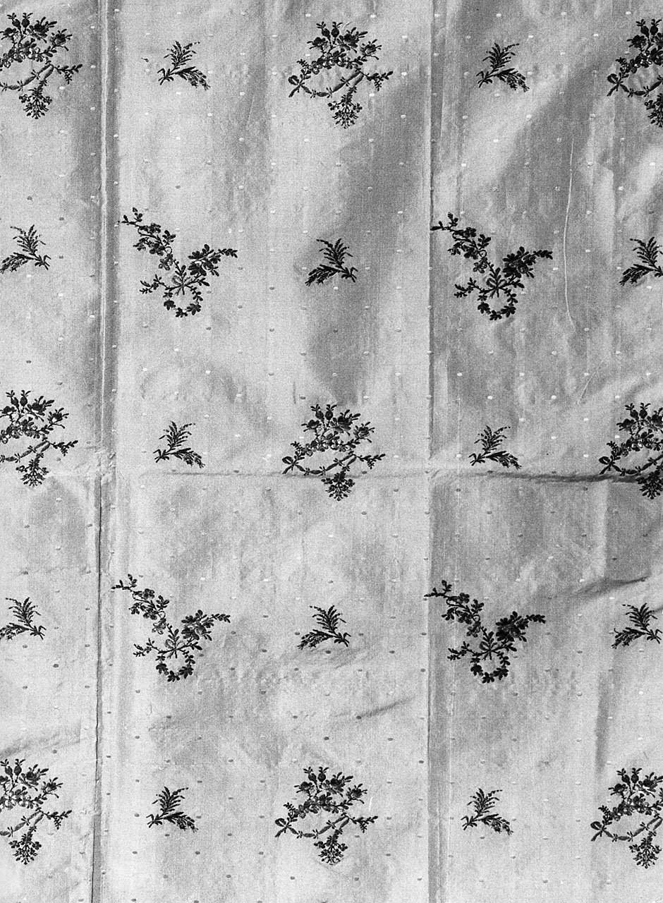- NOTIZIE STORICO CRITICHE Il tessuto d'abbigliamento presenta i caratteri stilistici dello stile Luigi XVI con i caratteristici motivi floreali ridotti di dimensioni e stilizzati, inseriti in uno schema decorativo molto organico, che passerà nello stile I Impero. La qualità del disegno e del tessuto riportano alle manifatture lionesi ancora in Grado di produrre tessuti di grande qualità, con la quale la produzione italiana non poteva concorrere