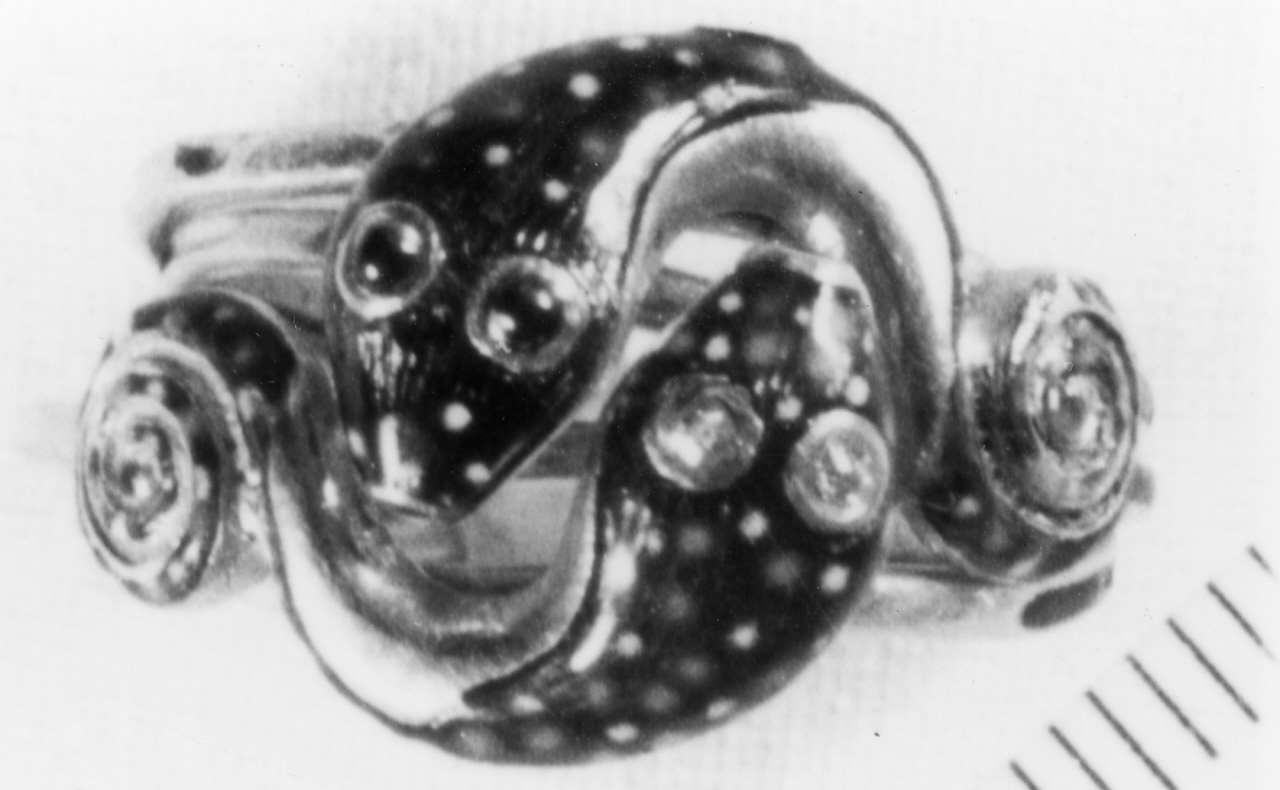 L'anello è formato da due teste di serpi in smalto verde e rosso. E' scomponibile in quattro anelli