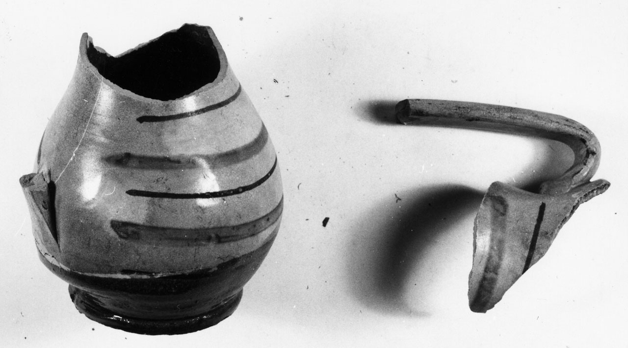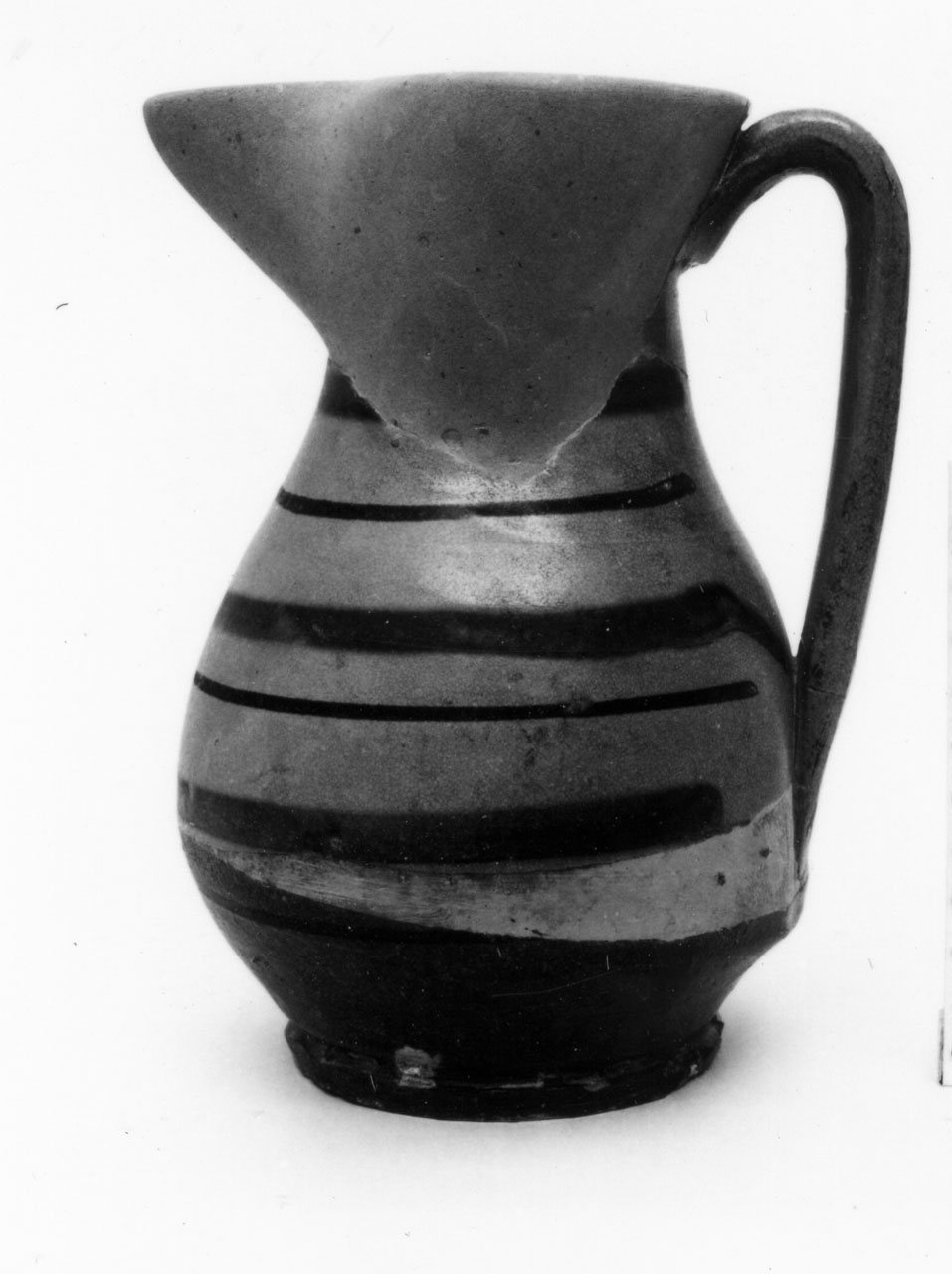 Boccale ansato dal corpo piriforme e piede a disco. Frammentario, mancante di corpo e collo, è stato poi restaurato. Decorazioni a motivi geometrici, linee parallele orizzontali