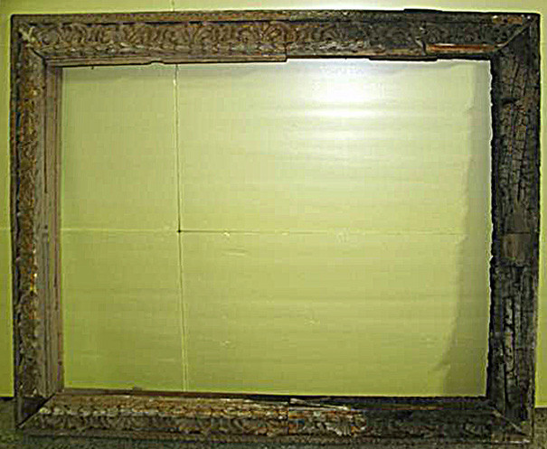 Cornice dorata decorata sulla fascia da foglie di cavolo aperte e sottofoglie, da una teoria di foglie stilizzate ricorrenti dipartenti dal centro; battuta a gole lisce, profilo esterno a fogliette lanceolate?