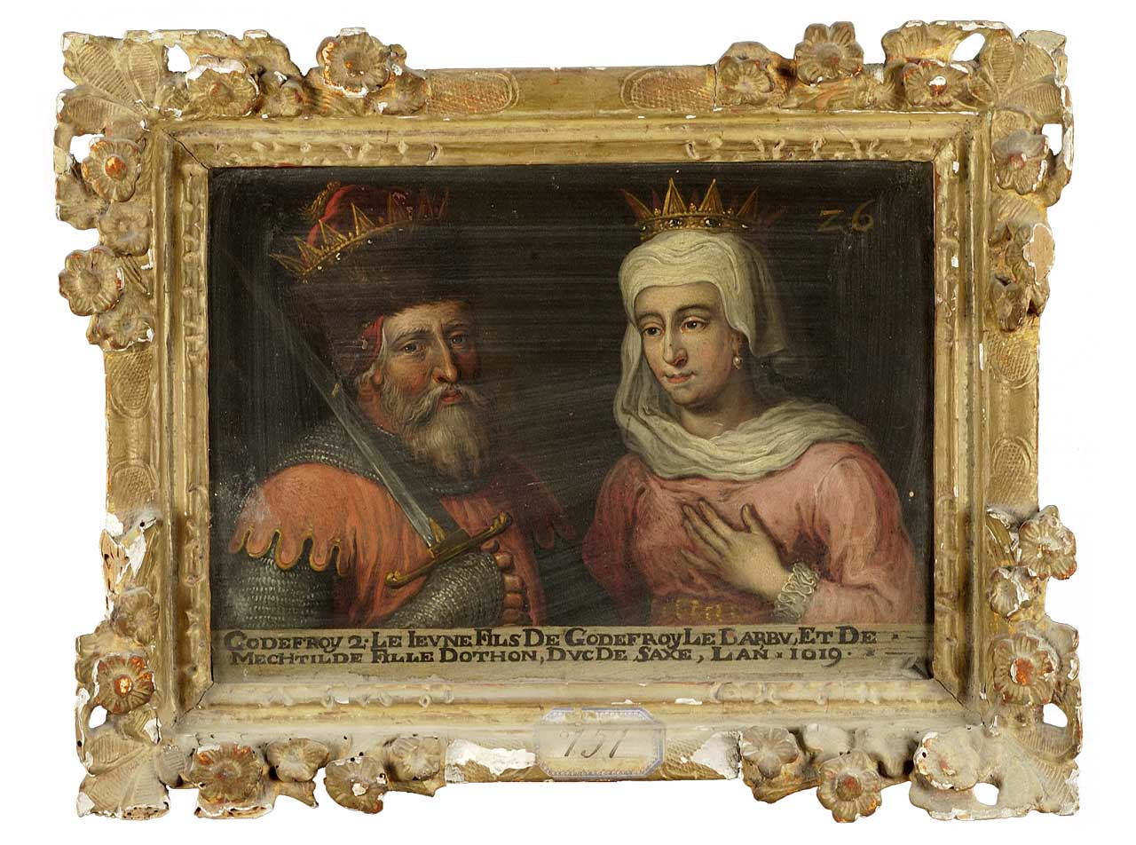 - NOTIZIE STORICO CRITICHE L'opera appartiene ad una serie di sessanta dipinti conosciuti come "doppi ritratti lorenesi", dai nomi dei personaggi rappresentati, tutti apparten enti alla casata dei Lorena. Questo gruppo di dipinti è da mettere in conn essione con una serie di maggiore formato costituita da 46 ritratti su tel a (24 di uomini, Inv. 1890, nn. 363-386, e 22 di donne, Inv. 1890, nn. 387 -408) dove i personaggi sono effigiati singolarmente ma con analoghe scrit te (cfr. Meloni in "Gli Uffizi...", II, p. 737). Questa serie di maggiore formato è quindi più piccola, vi compaiono infatti i membri della famiglia vissuti a partire dal XIV secolo fino ad arrivare a Carlo III, mentre i d oppi ritratti in rame raffigurano anche le generazioni precedenti, risalen do al IV secolo e arrivando a comprendere i successori di Carlo III, fino a Carlo IV, nonno di Francesco Stefano di Lorena primo Granduca di Toscana . I tipi iconografici utilizzati da entrambe le versioni sono comunque gli stessi. La tipologia del ritratto rappresentante una coppia a mezzo busto esiste in Francia fin dal XVI secolo. Questa serie è giunta con ogni prob abilità a Firenze con l'instaurazione della dinastia dei Lorena - dopo l'e stinzione della famiglia Medici avvenuta nel 1737 con la morte di Gian Gas tone - forse portati da Pietro Leopoldo (1747-1792); egli è infatti il pri mo granduca lorenese a risiedere stabilmente a Palazzo Pitti dopo il perio do della reggenza, ed è legittimo supporre che volesse dotare la nuova cor te di una serie di ritratti di antenati celebranti il prestigio della fami glia