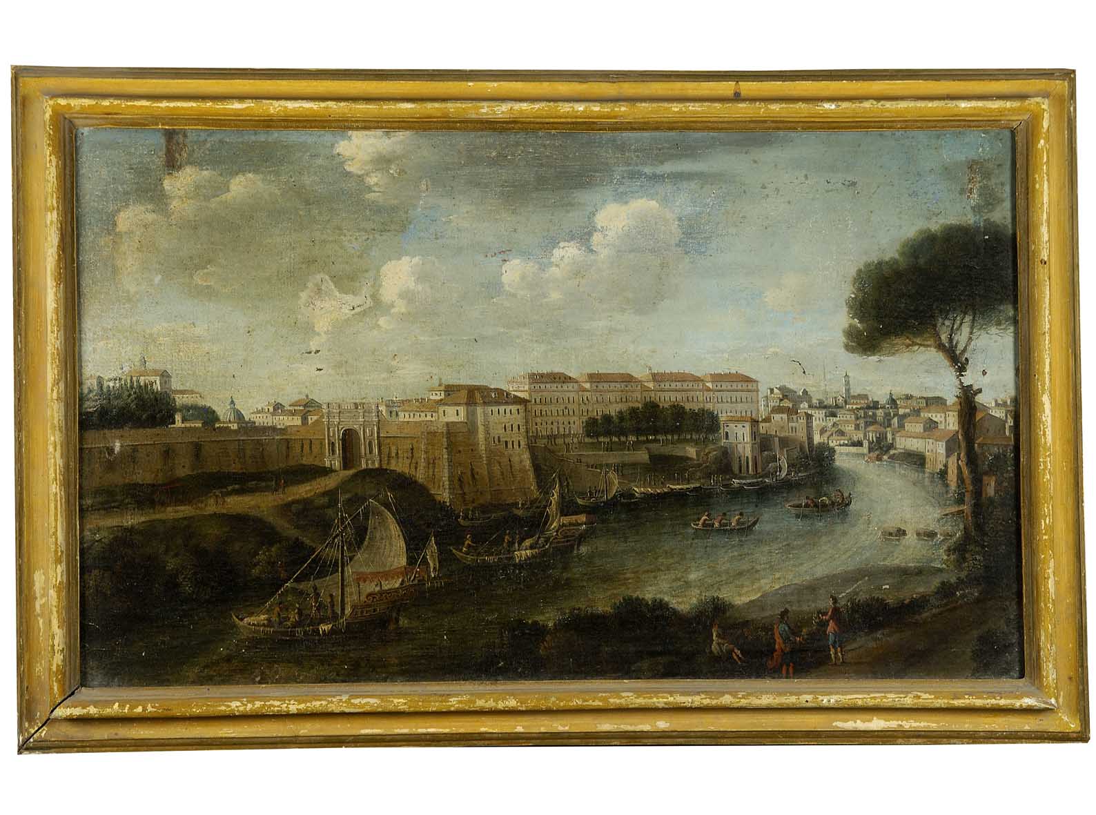 - NOTIZIE STORICO CRITICHE Il dipinto, conservato presso i depositi del Soffittone di Palazzo Pitti, raffigura un paesaggio con fiume e architetture, da identificare con la veduta di Porta Portese a Roma. Dall'analisi stilistica, si può attribuire l'opera al pittore Hendrik van Lint. Un felicissimo soggetto dell'artista di Anversa fu quello delle vedute fluviali romane con i loro ponti e le loro ripe. La nostra è da avvicinare a quella con "il Porto di Pripetta visto dall'edificio della dogana" (Roma, collezione privata)