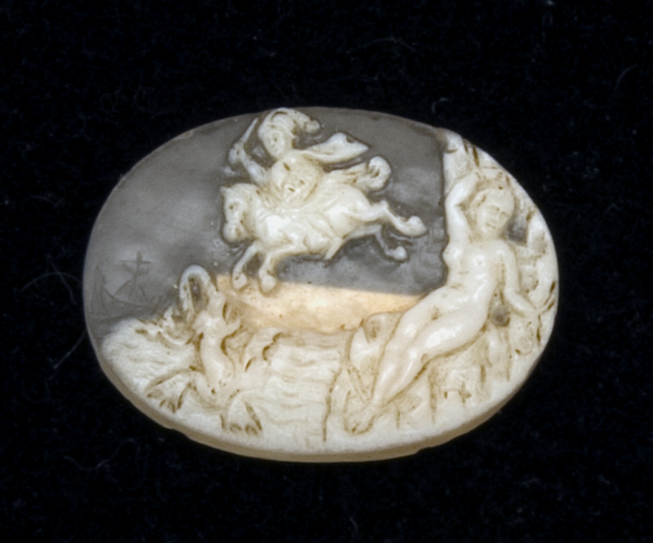 - NOTIZIE STORICO CRITICHE Il cammeo, rintracciato fino all'inventario redatto da Giuseppe Bencivenni Pelli nel 1786, rappresenta il celebre episodio della liberazione dall'orca di Angelica ad opera di Ruggero narrato nel X canto dell'"Orlando furioso" dell'Ariosto, e non quello mitologico di Perseo e Andromeda, come fu ipotizzato da Michele Arcangiolo Migliarini nell'inventario generale della dattilioteca del 1837. Il tema godette di particolare fortuna in campo pittorico nel corso del XVII secolo (E. FUMAGALLI-M. ROSSI-R. SPINELLI, "L'arme e gli amori. La poesia di Ariosto, Tasso e Guarini nell'arte fiorentina del Seicento", catalogo della mostra, Livorno 2001, pp. 208-209), periodo al quale può essere fatto risalire anche il piccolo rilievo in agata del Museo degli Argenti