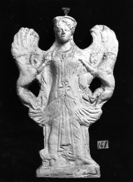 Antefissa raffigurante una figura femminile alata con leoni rampanti , che poggiano le zampe anteriori sulle spalle della figura